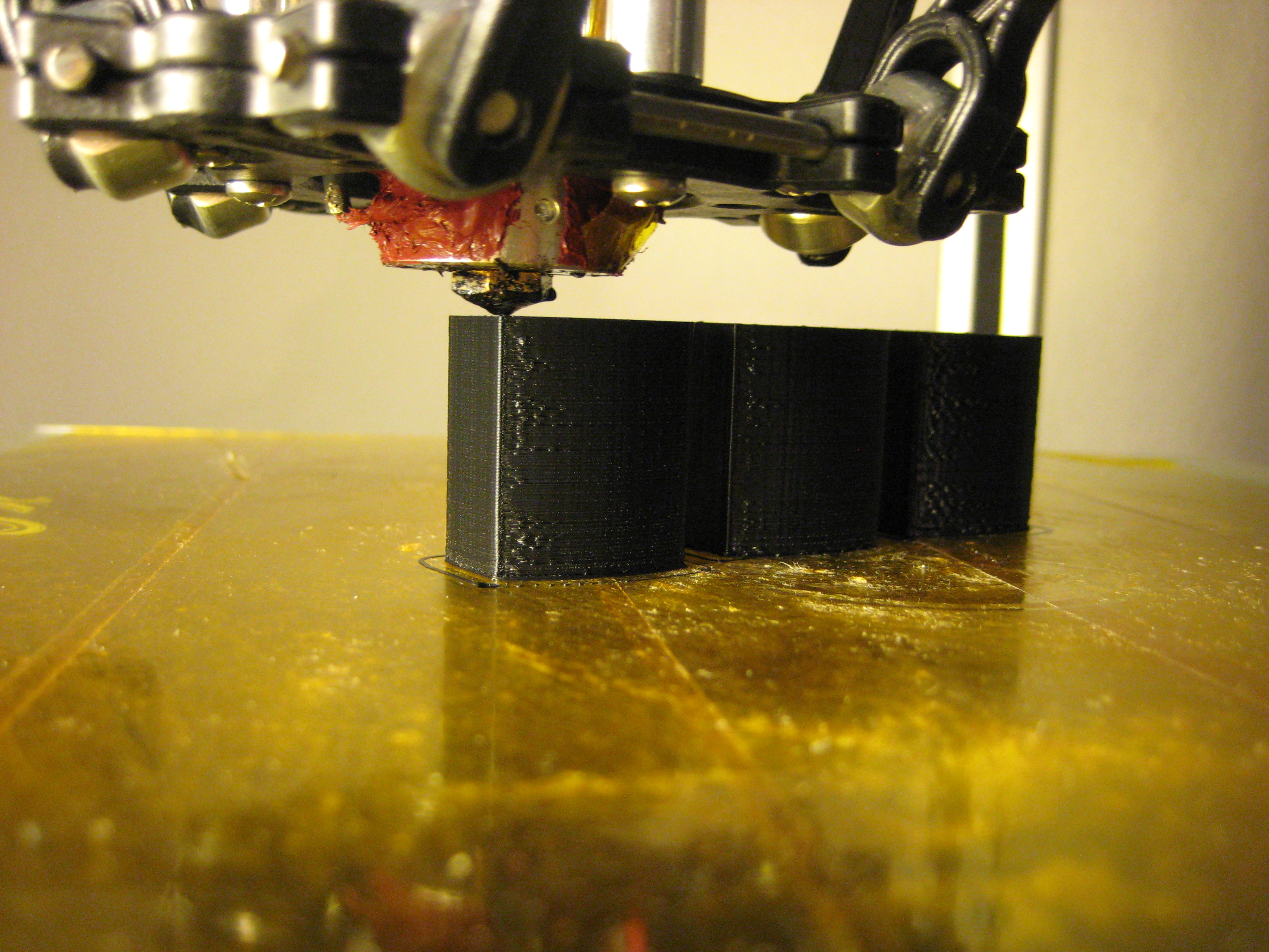Hi there, my Rostock has been dialed in rather ok. I tried slic3r in the beginning and changed to Kiss later on. I think that Kiss produces better G-Code in most cases. So i modelled and printed a hanger for my bathroom door and it works well. But take a look at its structure. It seems like the layer is oscilating somehow. It is a perfect repeating pattern. Any idea what the reason could be? and . Now yesterday i played with a different ABS plastic (Black one) and i printed out a box. Yeah i know its not perfect, but again i had some repeating patterns that i coudl not find what to do against but they do look different. . Also i recognize that in the beginning the extrusion of the filament seems to be "late" and the some layers look like the flow is to low but i print at rather slow speed and the rest of the layers look right. Any ideas?
