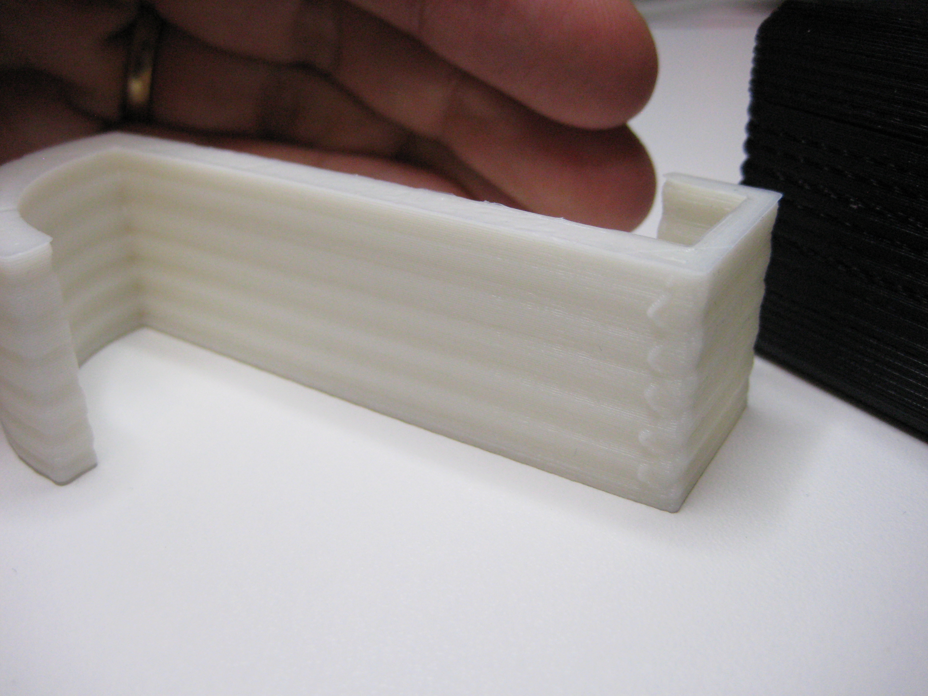 Hi there, my Rostock has been dialed in rather ok. I tried slic3r in the beginning and changed to Kiss later on. I think that Kiss produces better G-Code in most cases. So i modelled and printed a hanger for my bathroom door and it works well. But take a look at its structure. It seems like the layer is oscilating somehow. It is a perfect repeating pattern. Any idea what the reason could be? and . Now yesterday i played with a different ABS plastic (Black one) and i printed out a box. Yeah i know its not perfect, but again i had some repeating patterns that i coudl not find what to do against but they do look different. . Also i recognize that in the beginning the extrusion of the filament seems to be "late" and the some layers look like the flow is to low but i print at rather slow speed and the rest of the layers look right. Any ideas?