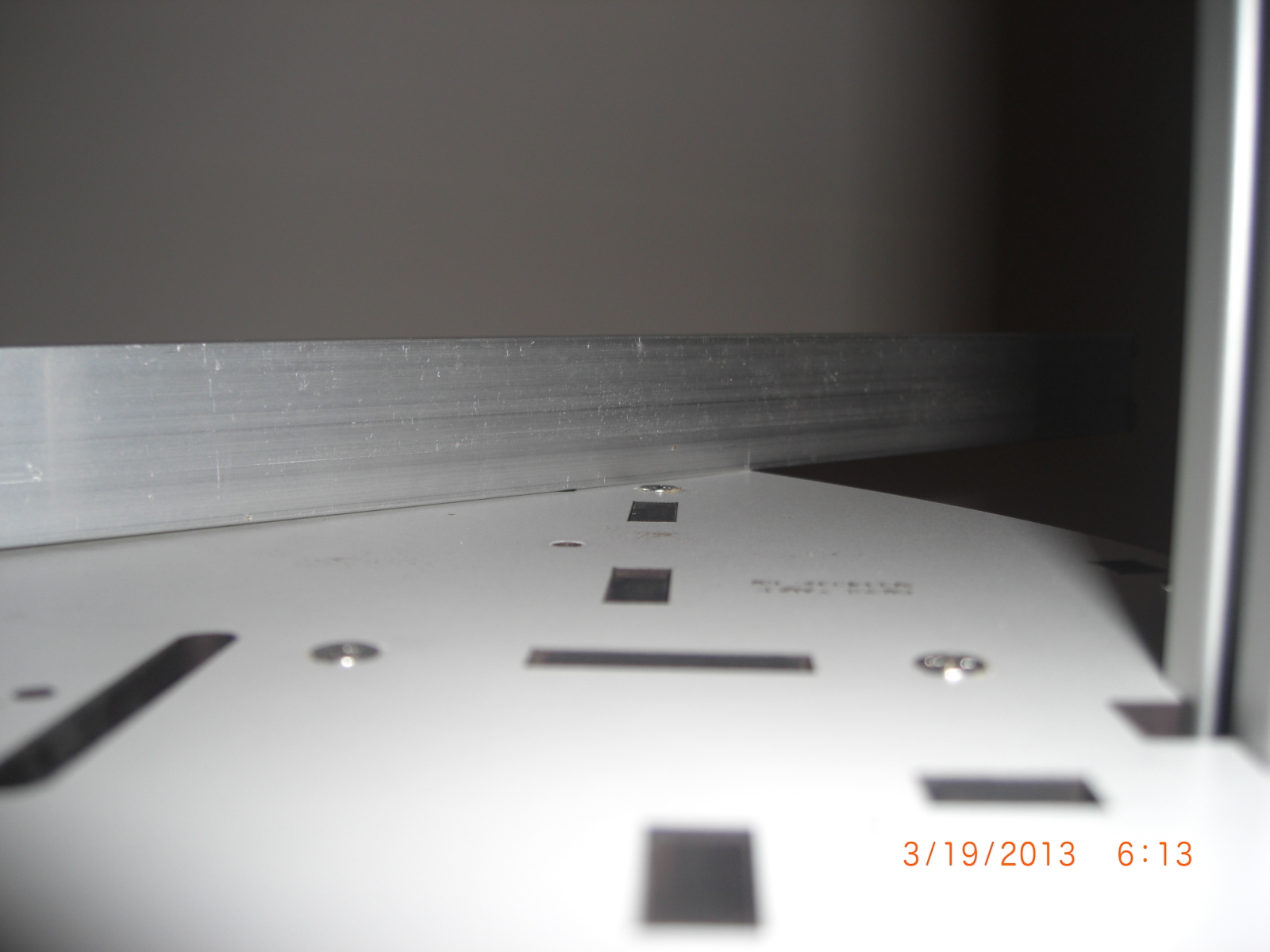 mhackney wrote:That's a bit odd. Mine was dead flat on assembly. I would have thought all of those internal base partitions would prevent it from bowing like that. Are all the screws snugged up? How's the bottom?