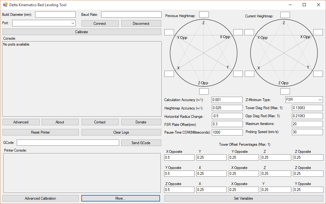 Also, forgot to mention that pressing Enter Defaults is a necessity, unless you are using expert settings! But you seemed to find that, good thing... This causes an error because it will not be able to compute the XYZ/diagonal rod offset percentages (without providing the 4 height-maps or pressing enter defaults they are zero), then it will do some fun dividing/multiplying by zero, messing up the calculation, causing an infinite loop too(until it is closed), etc.HumanLiberty wrote: Thanks Rollie - turned out in my case it was due to a failure to press "Enter Defaults"