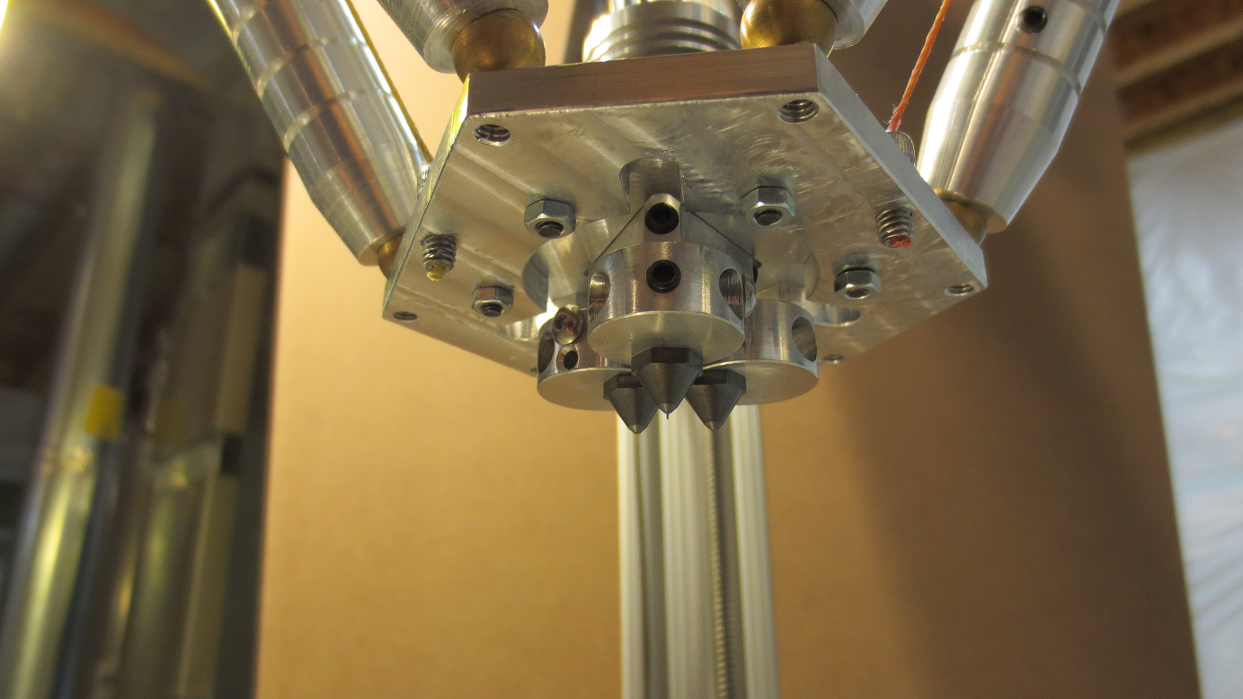 I'm building a large Delta printer. Print space is ~17" (430mm) diameter, ~22 inches (550mm) tall. Right now my design is using fast travel precision leadscrews for linear motion, but the frame is compatible with belt/pulley drive as well. Almost all of the parts are aluminum or steel, made adjustable with tight tolerances. The printer will be fully enclosed with temperature control up to at least 150C, probably higher. I can't yet disclose some of the details of the enclosure. For now I'm using my Tri hotend for triple extrusion on a non-magnetic ball joint effector.