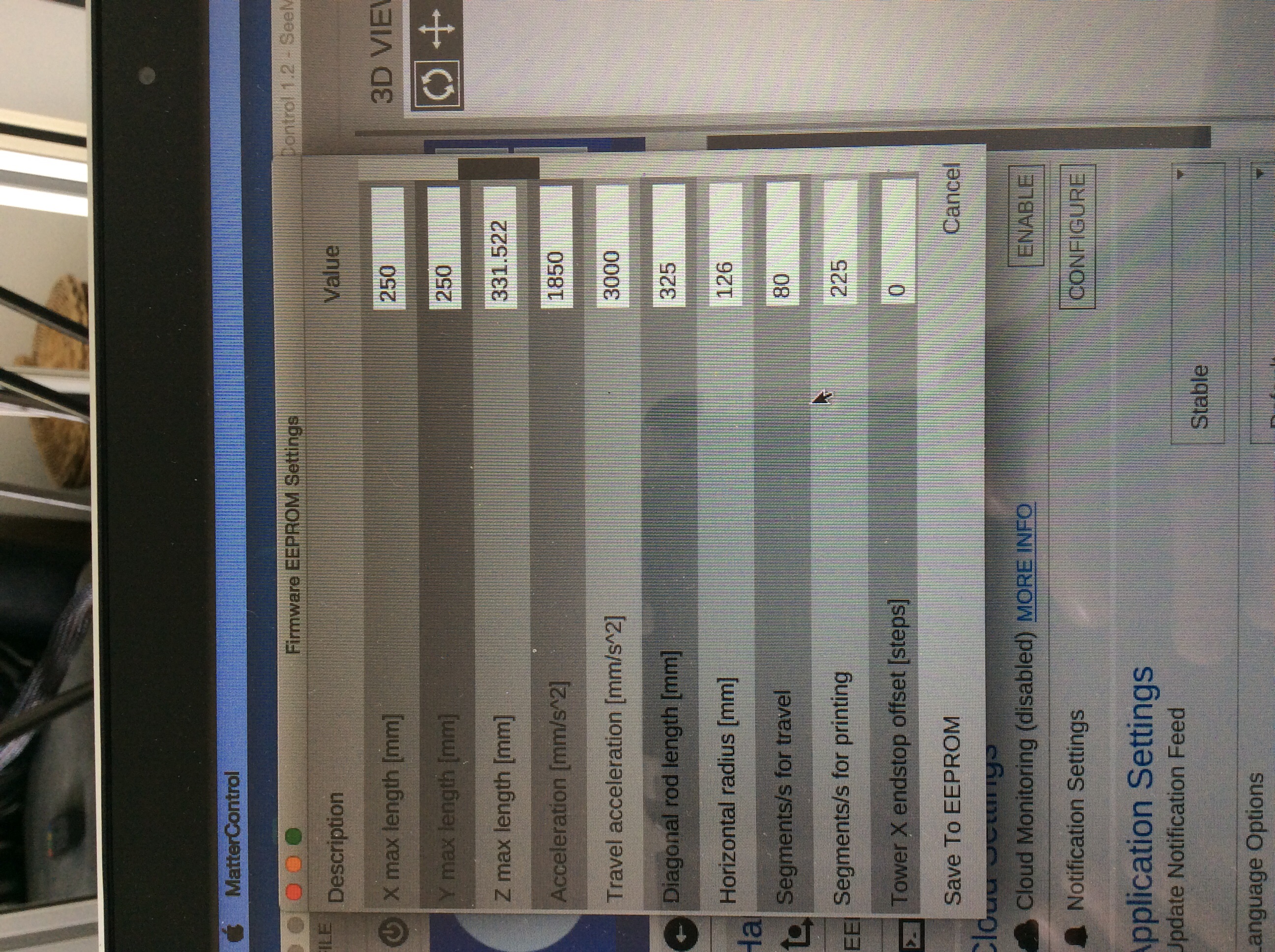 As per the manual if I want to lower the nozzle the increase the value, raise nozzle decrease... But I can't even get to this stage yet... As I calibrate the z tower the hot end hits the build plate with the end stop screw maxed out into the new moulded carriage. Haven't tried x and y yet.... Sorry for the bad iPad pic... More to come.