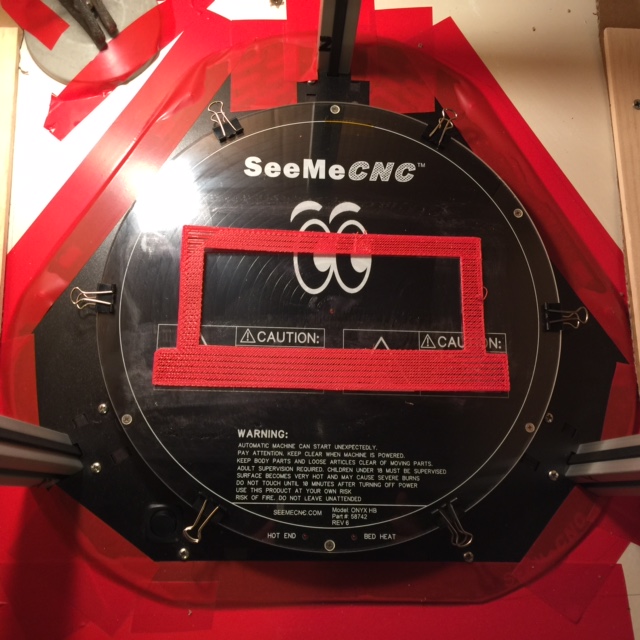 The hot end drags on the printed material on some passes. Very odd. The first few layers came out near perfectly. I was very happy with the consistency of the extruded material, etc.