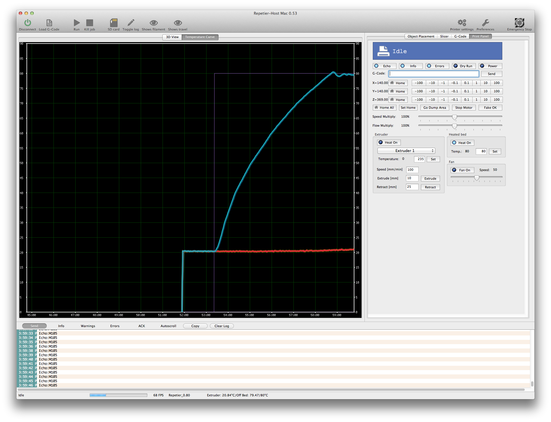 With my 24V supply, the naked Onyx heats incredibly fast to 100°C. Putting anything on it like aluminum or glass or both adds thermal mass that needs to be heated via convection. This takes power, so of course it takes longer to get to temperature with either or both of these for the same power input. Currently, I have my 1/8" thick aluminum heat dissipator and the borosilicate glass plate on top of that - a fair amount of extra mass to heat up. Below is my temperature-time curve from Repetier that shows heating the Onyx from 21°C to 80°C with the aluminum and glass in place. It took just a hair over 5 minutes. I've done the auto PID calibrate on this and you can see the temperature rises and stabilizes pretty quickly. The temperature - measured with a thermocouple - at the center of glass surface after stabilizing was 80.1°C and several points at the very edge of the glass were 79.2° and higher - very even temperature distribution.
