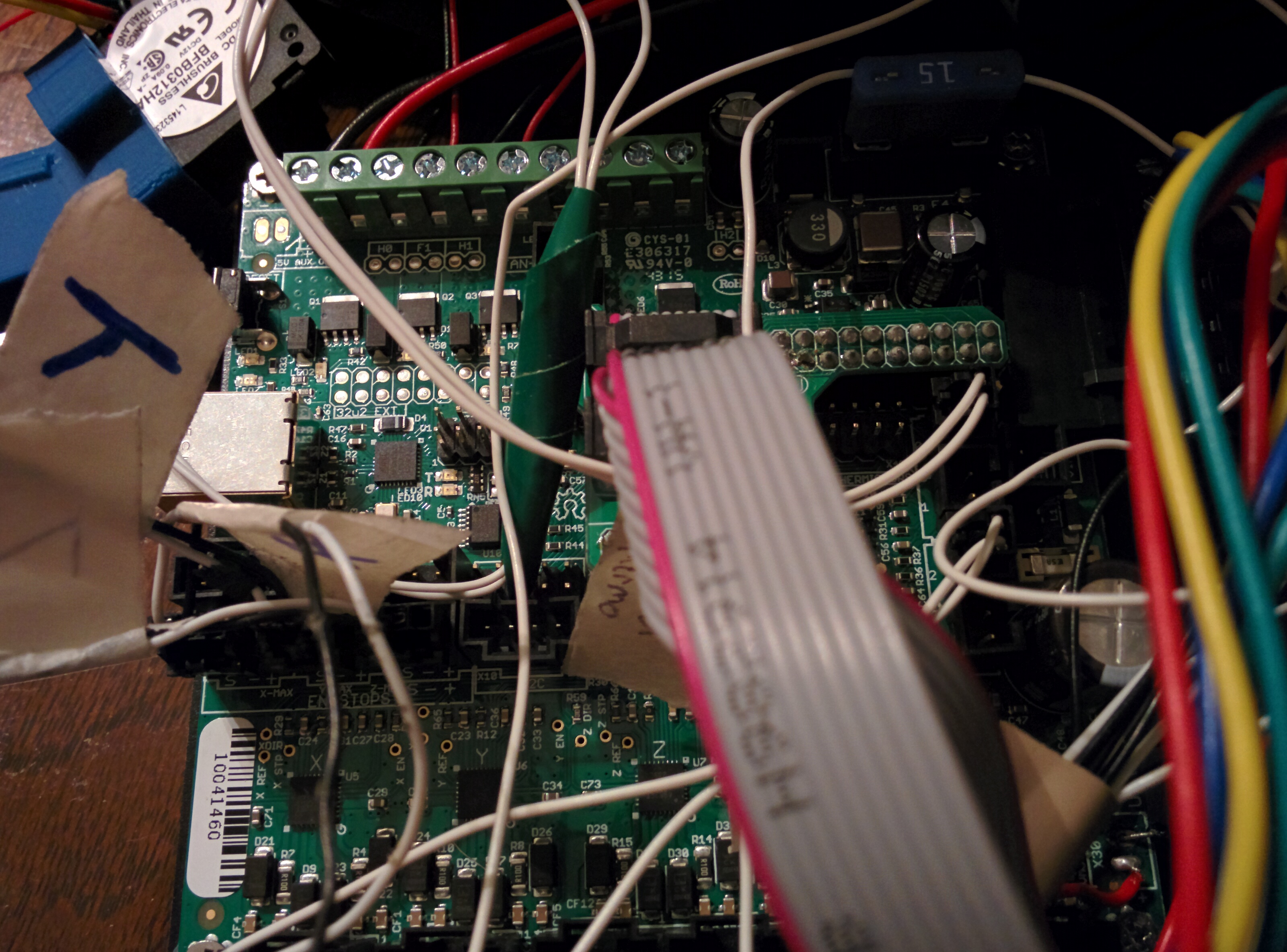 The logic is powered by 5V regulated down from 12V on the board...even when shorted, that regulator won't draw enough current to blow the 12V fuse. Measure what voltage the 5V area has, if any. The easiest spots are probably the bare pads in the upper left corner of your picture near the "5V aux out" label or the +/- pins on any of the endstop connectors (refer to the diagram I posted before). I'm guessing you'll find no voltage indicated, indicating a probable short somewhere. Earthbound may have already spotted it. If you do find 5V in those places, then I'd guess the cpu likely isnt working and you need a replacement board.