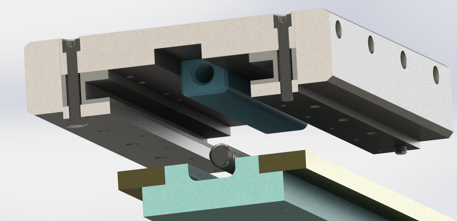 The new gibs will be pushed against the brass strip by set screws on the sides and bottom of the acetal gibs. The gibs will be much easier to make and align compared to the dovetail ones earlier. I'm also going to switch from 3/8-6 leadscrews to 1/2-5 leadscrews for more torsional rigidity. The end bearing blocks will now have 1 deep groove ball bearing and 2 thrust roller bearings instead of 2 deep groove ball bearings.