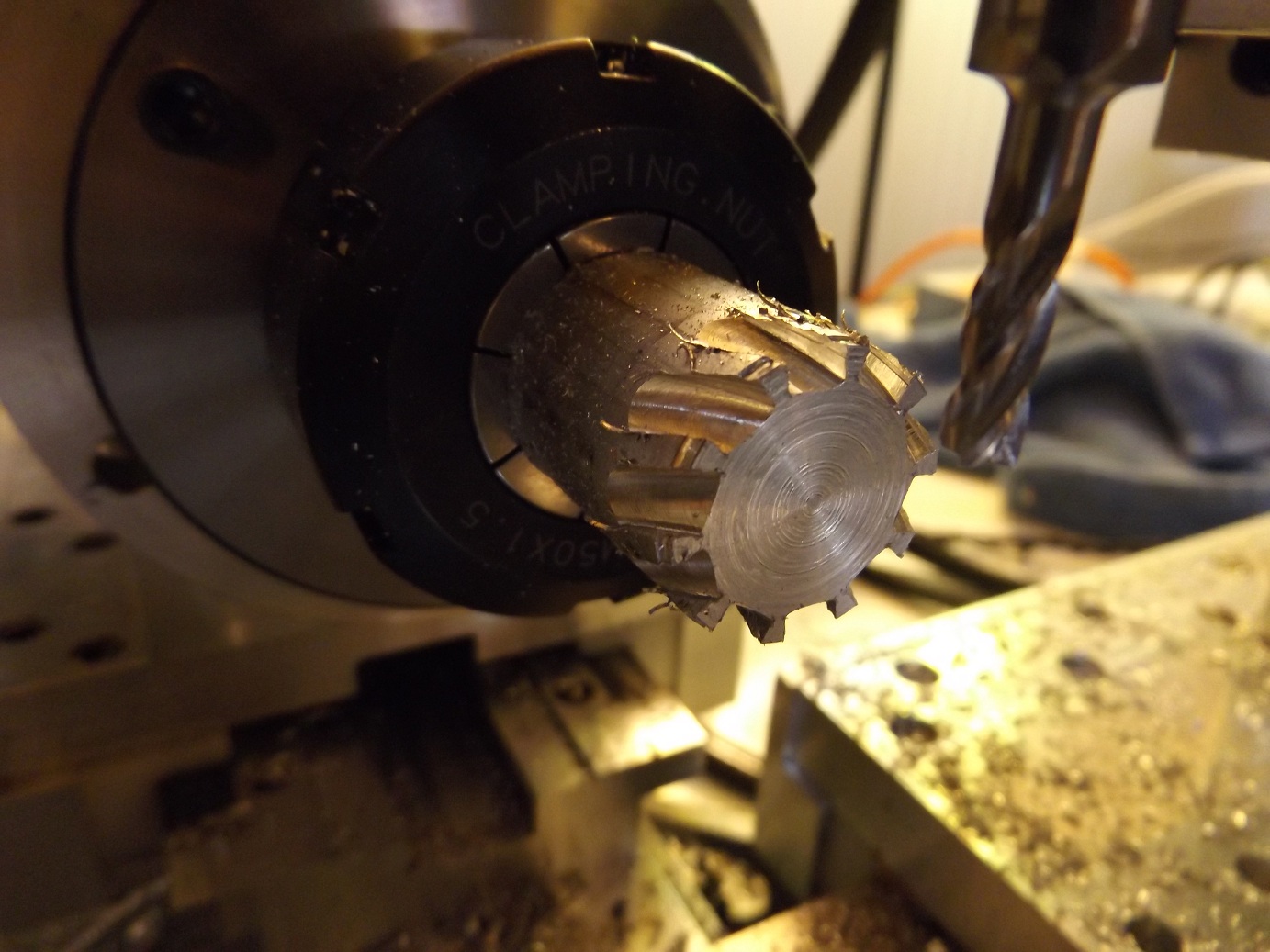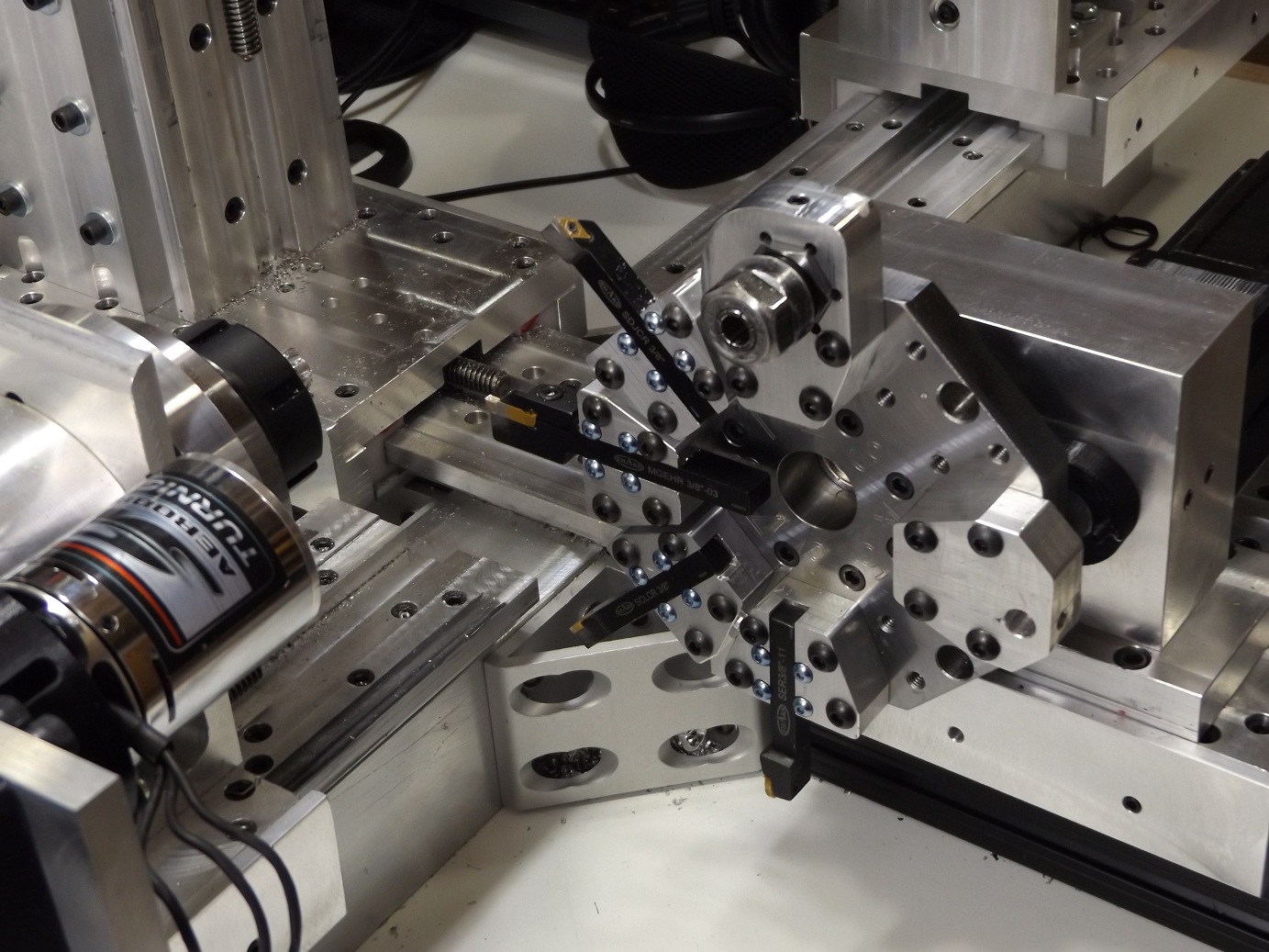 Another update on this thing. I haven't gotten that much done in the last few weeks on it. It can turn, thread, and mill parts in an ER40 collet or a 5 inch 3 jaw chuck. The spindle is eccentric by about 0.00015" or 3-4 microns because I used cheap non-precision bearings, but that's actually better than I expected. Static rigidity at the spindle nose looks to be about 40,000 to 100,000 pounds per inch of deflection, which isn't as good as full sized machines. I blame the thin-walled aluminum body tube for this floppiness.