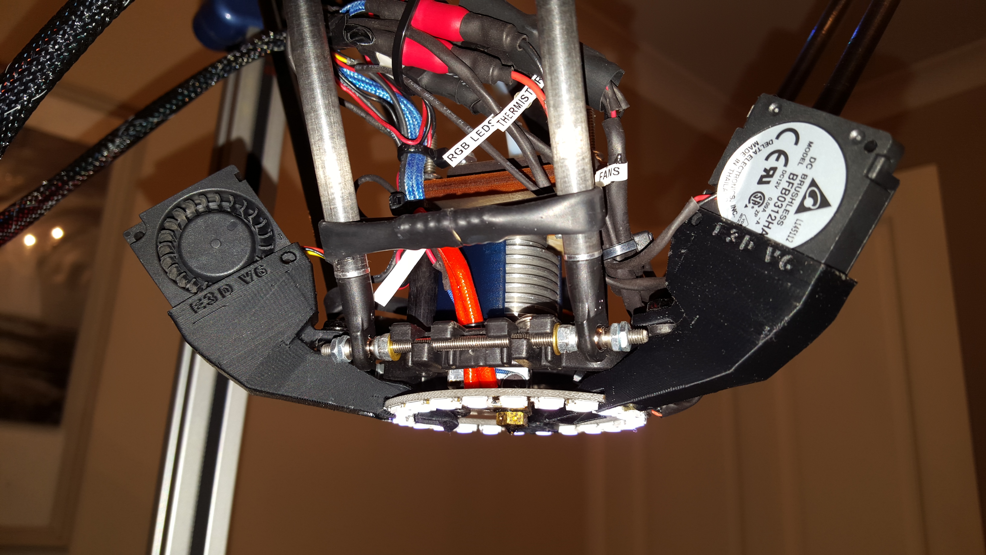 The RGB ring is held in position by 3x ABS printed fan ducts for part cooling. These house 3x 30mm fans that can run at full 100% and not take heat away from the hot end.