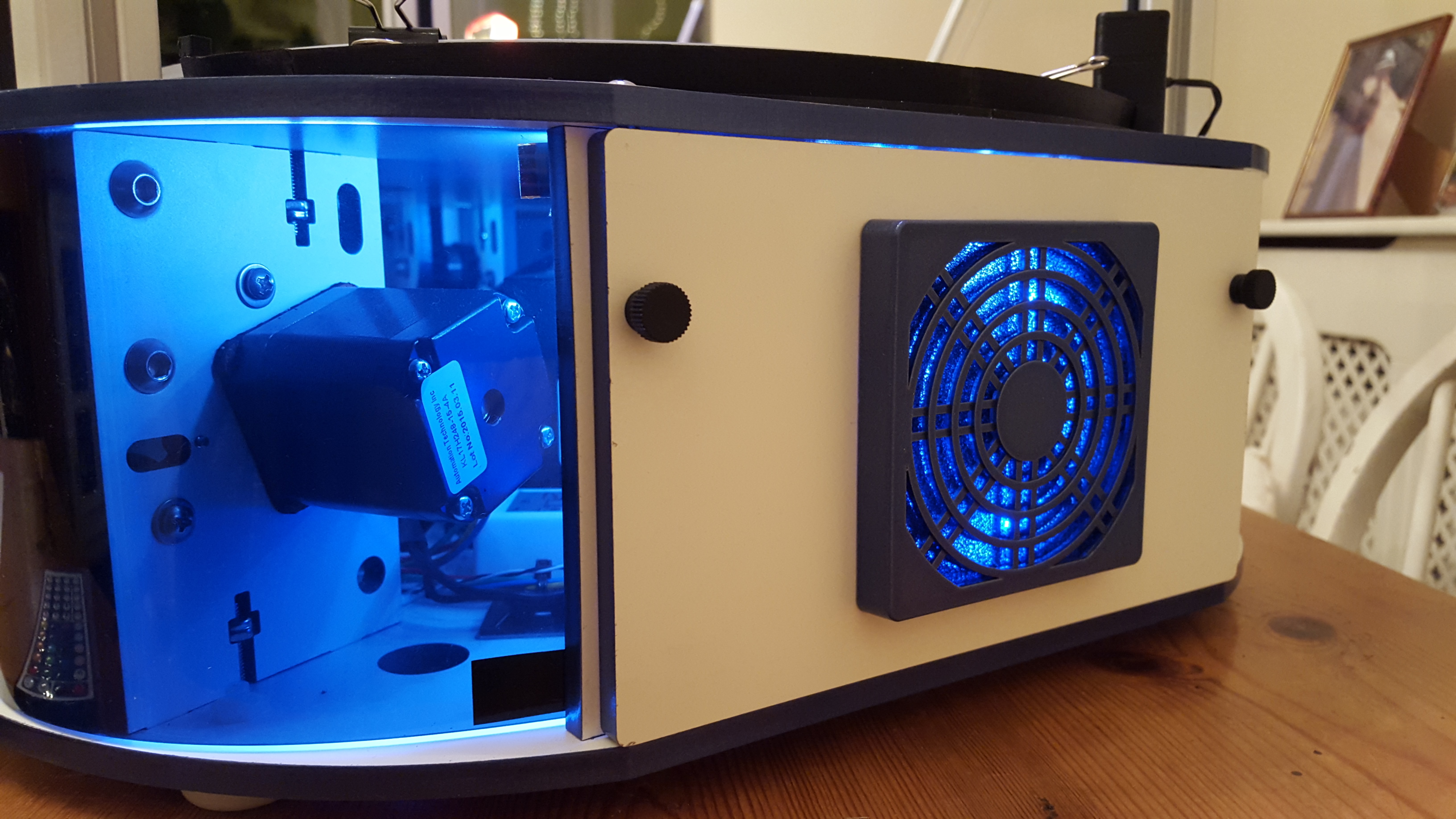 Also a custom Arduino driven Adafruit 24 RGB Led ring mounted under the hot end. This monitors the chassis RGB leds and copies their colour. I usually have it set to white to help with monitoring the print.