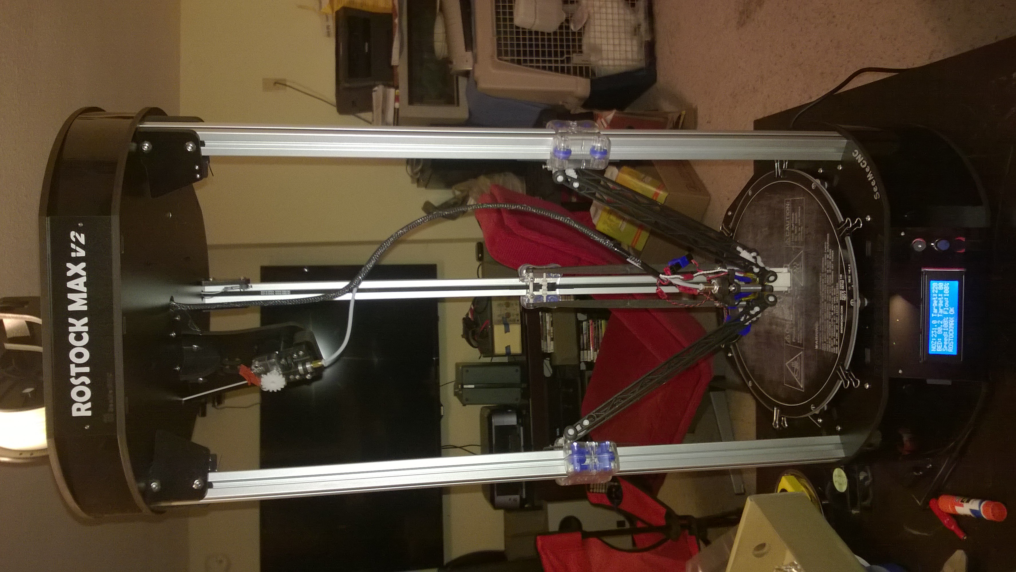 Howdy - I received a Rostock Max v2 kit for my birthday, thanks to my wonderful family pooling their resources. The printer is amazing, and the build was super fun. I built it (mostly) stock to start with, but I changed a few things.