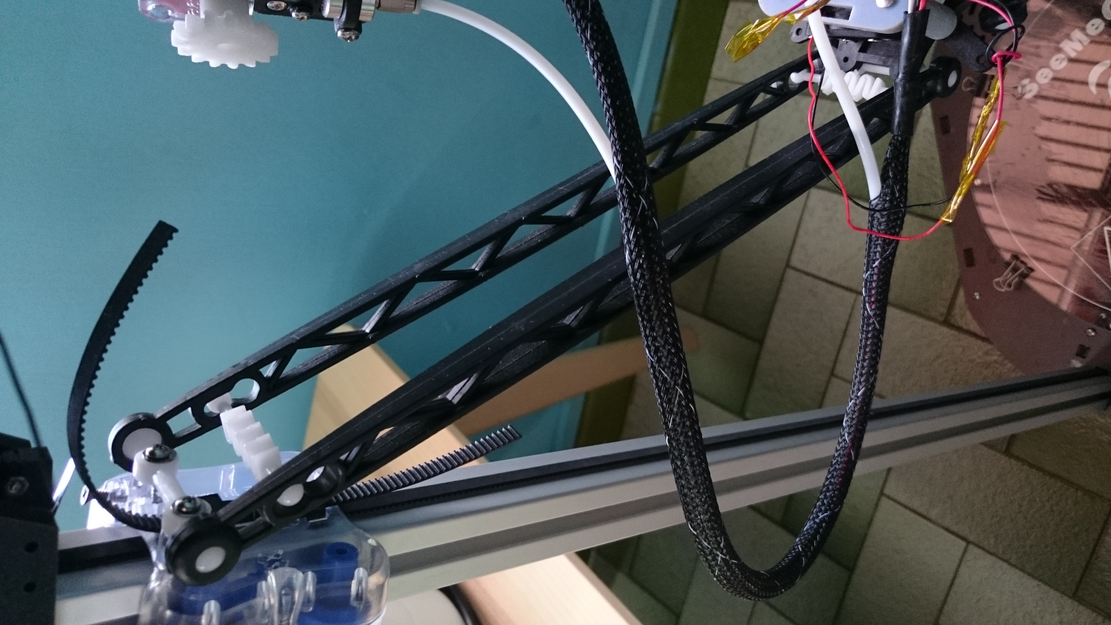 The arms are the stock arms provided in the DIY kit from SeeMeCNC. (attached some photos in the post) The print was pretty okay until the last day when the machine couldn't last for more than half an hour and the print was slanted in the first 2 layers for some reason.