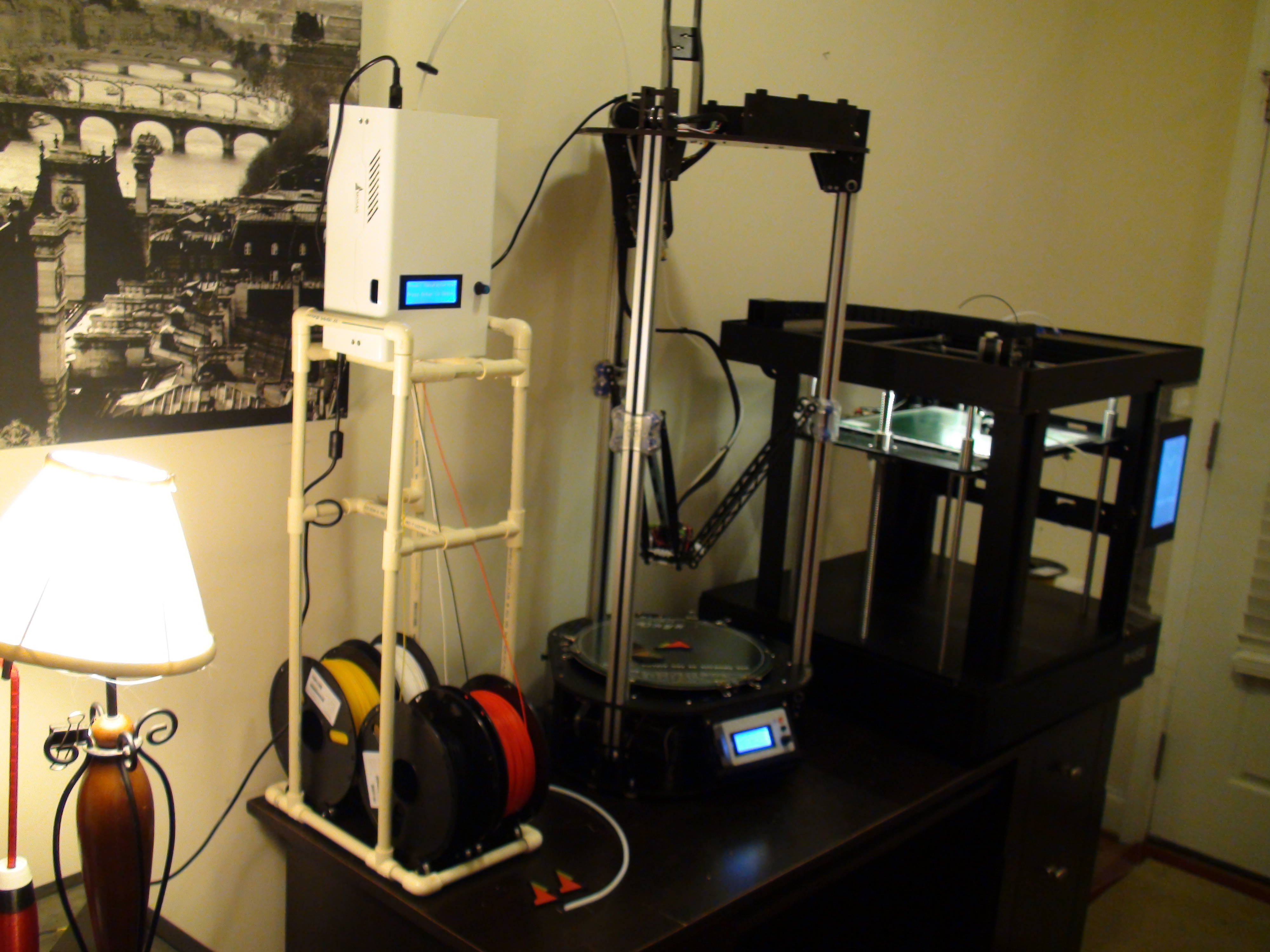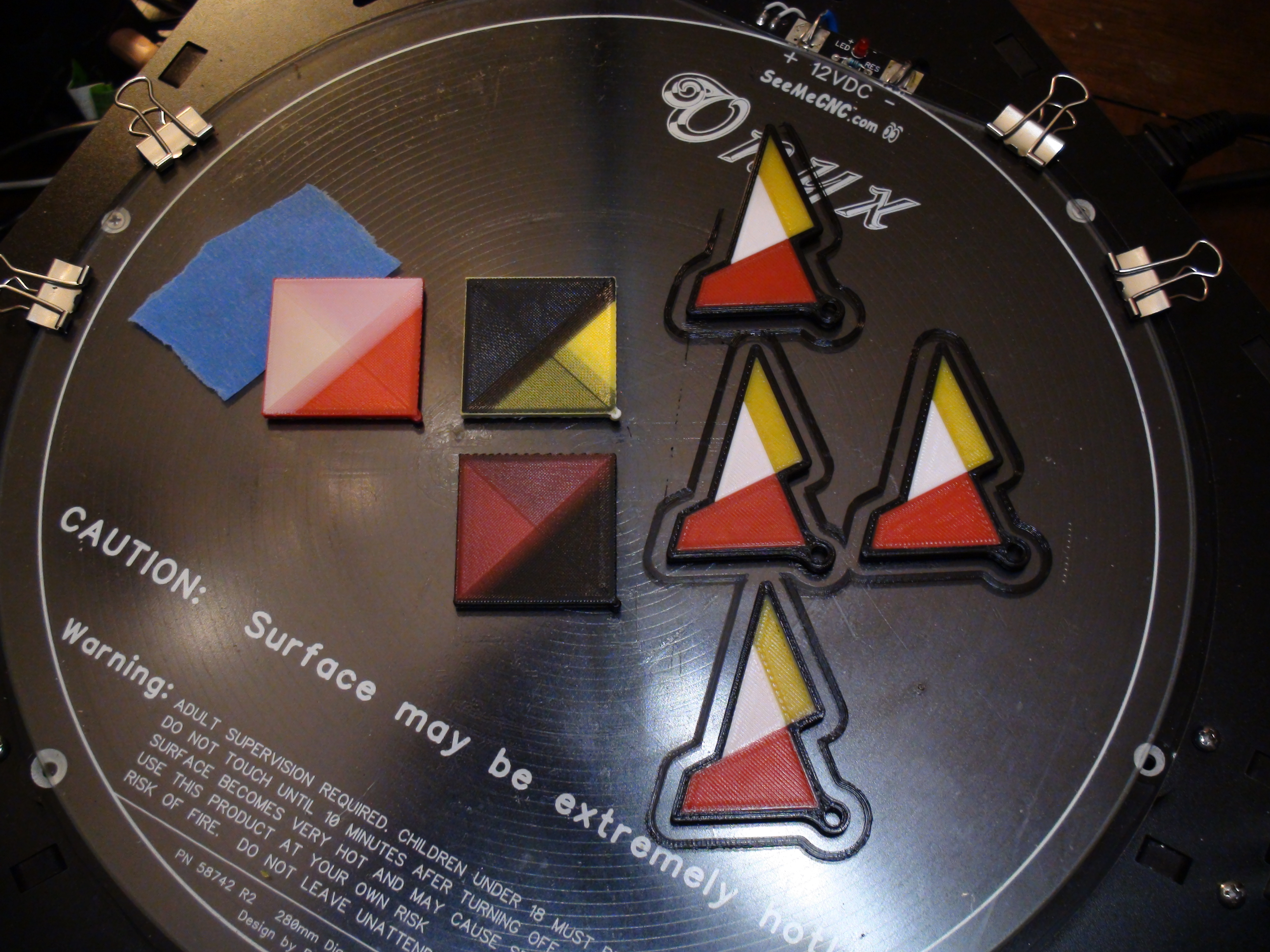 Here is a quick picture of a great successful print using 4 colors with the Mosaic Palette on the Rostock Max V2. Please ignore the blue tape, I discovered my leveling was a tiny bit off after having moved the printer and forgot to check before starting the print. I saw the first layer didn't stick on the purge/wiper block so just used masking tape on top of the first layer to make up for sloppy leveling.