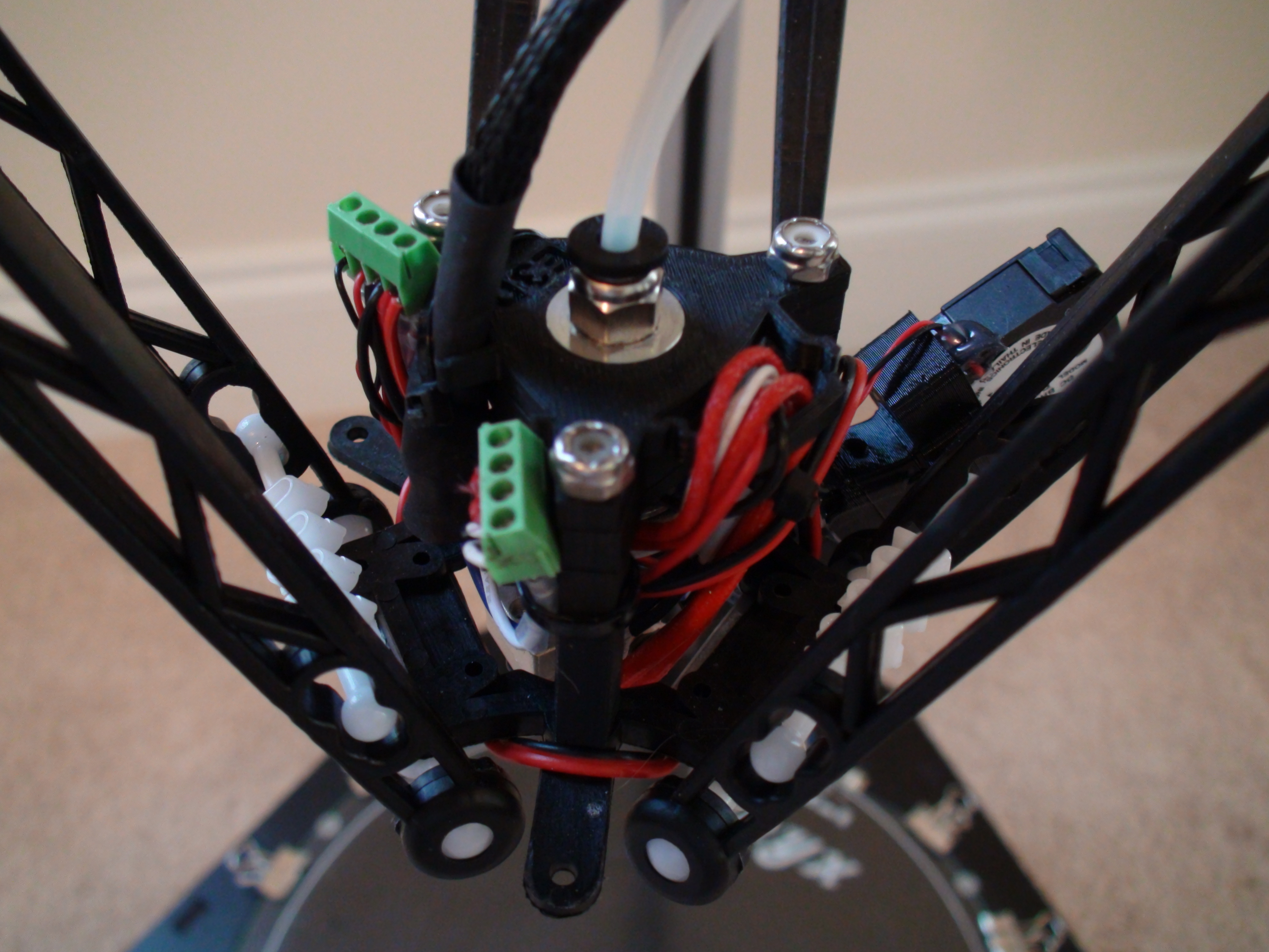 Side is both a 5 wire and a 2 wire in the V of the side where the rollers go. This is the contiguous wire run to the hotend. Has thermistor, 2 fans, extruder heater. If you wanted to be extra slick, I could use the heater power and then use the second red for a constant on source (say LEDs strips on the effector). As is, the hotend fan is temp controlled in repetier. The instant the heater turns on, it's on and stays on until the hotend is below 50C. As such, I wired in LEDS in parallel to the fan, such that the LEDS are effectively on the instant you call for heat, and don't turn off until well after a print finished and the head cooled to less than 50C.