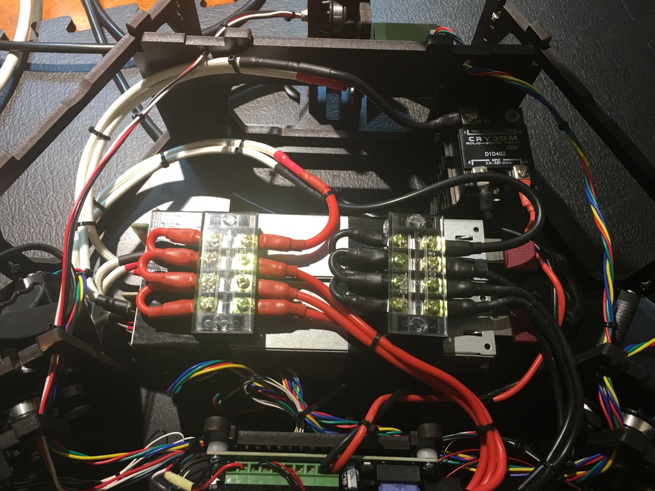 Heat dissipation was one of the things that I was initially worried about, as these are rather beefy power supplies. With the sides on, it's a bit hotter than I felt comfortable for the long-term life of melamine. However, by just taking one of the covers off temps run at about 10 degrees over ambient, which I'm really happy about. I plan on installing a small fan on one of the sides as soon as I locate a .stl of one of the sides, since I'm terrible at best at design; anyone have a copy? Will run a 24v fan on a 12v tap to keep db levels low. BTW, the power supply fans (remember there are 2 of them!) are variable and combined are quieter than the peek fan on my E3d, which is a HUGE plus to me, as I am usually in the workshop when I'm printing.
