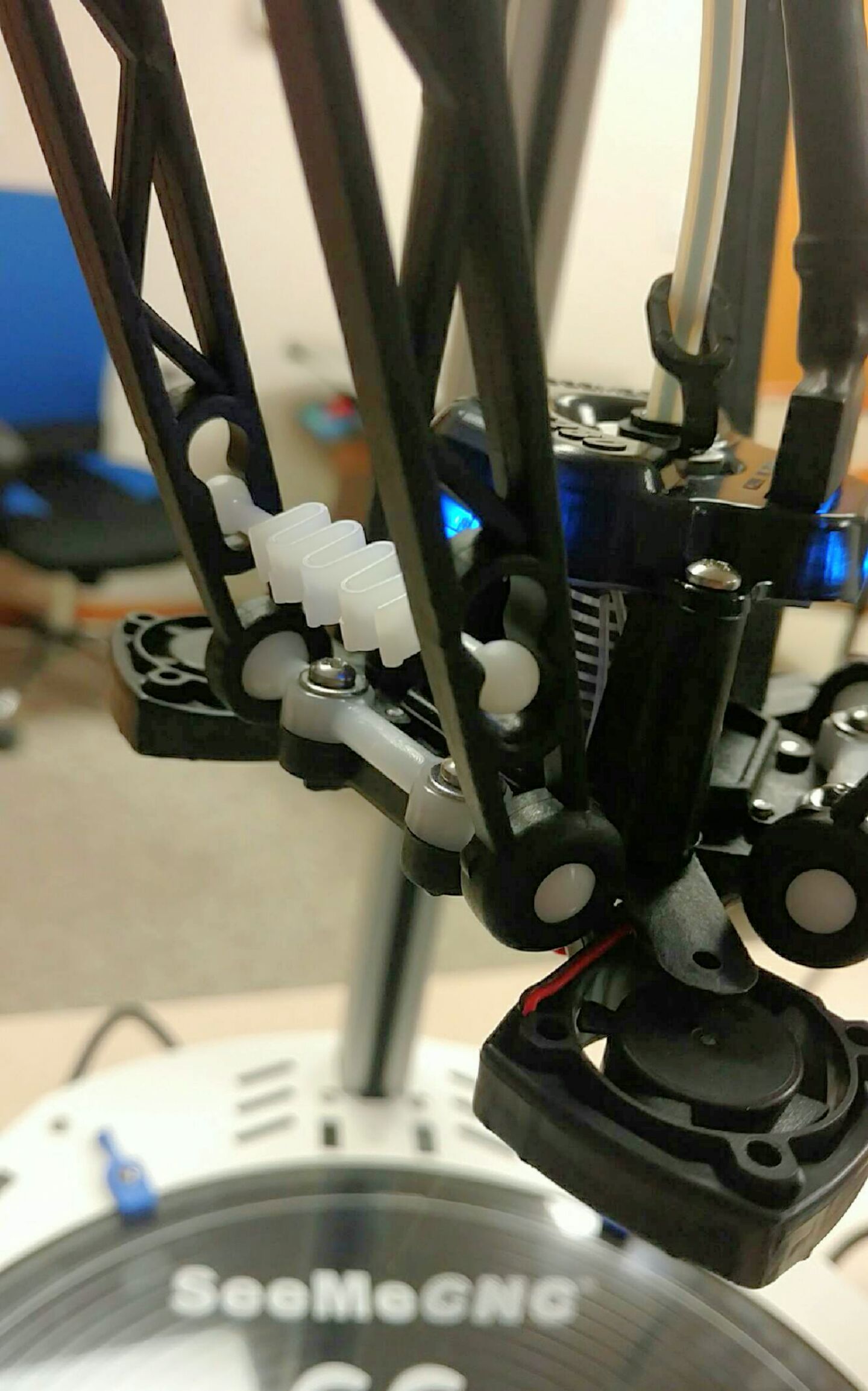 2A) Press-on ball joints firmly and complete first. THEN install washers and screws. If you use the screws the squeeze the ball joints onto the carriage or platform, the ball joints might now seat fully and dimensions and geometry critical to parallel kinematics will be off and cause problems.