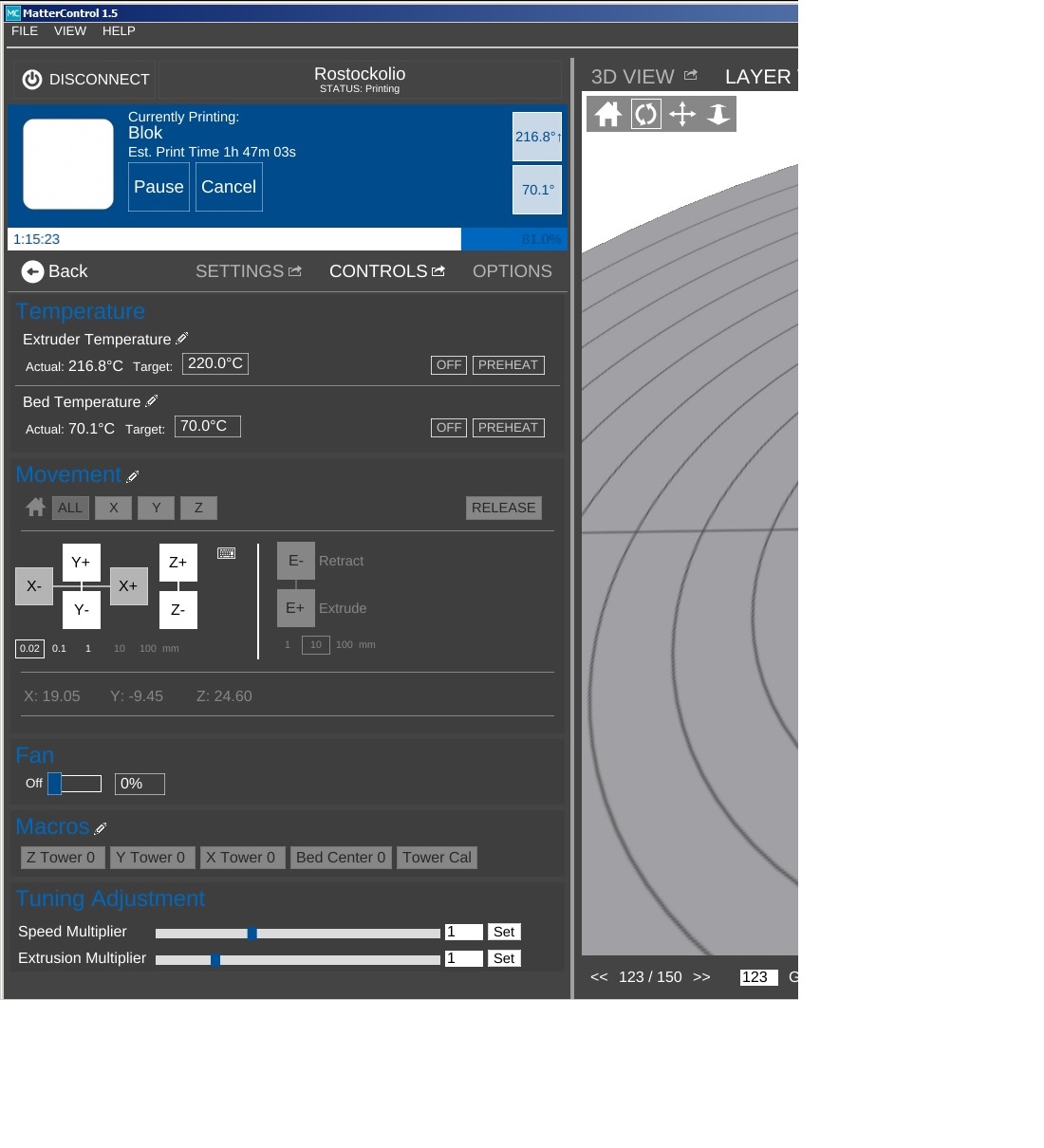 OK....so I have had the printer (Rostock Max V2) for about 2 years...and it's been printing fine. I print almost exclusively ABS, but I got some PLA and wanted to play around with it. I changed the settings in MatterControl and saved them as a preset and started printing, I noticed that the temperature of the bed and the nozzle were still the same as before I changed them. I stopped the print and checked my settings....the settings looked good...I rebooted the printer and restarted MatterControl to no avail. The printer won't go to the new temperatures. I can force the printer to go to the settings I want either by using the screen on the front of it, or by manually typing in the values in MatterControl Target box...but as soon as I click print the temps change to 220 and 70. Does anyone have any experience with this? Hopefully I am just missing something when I change settings. Also I switched back to ABS and am printing some test cubes in the screenshots.