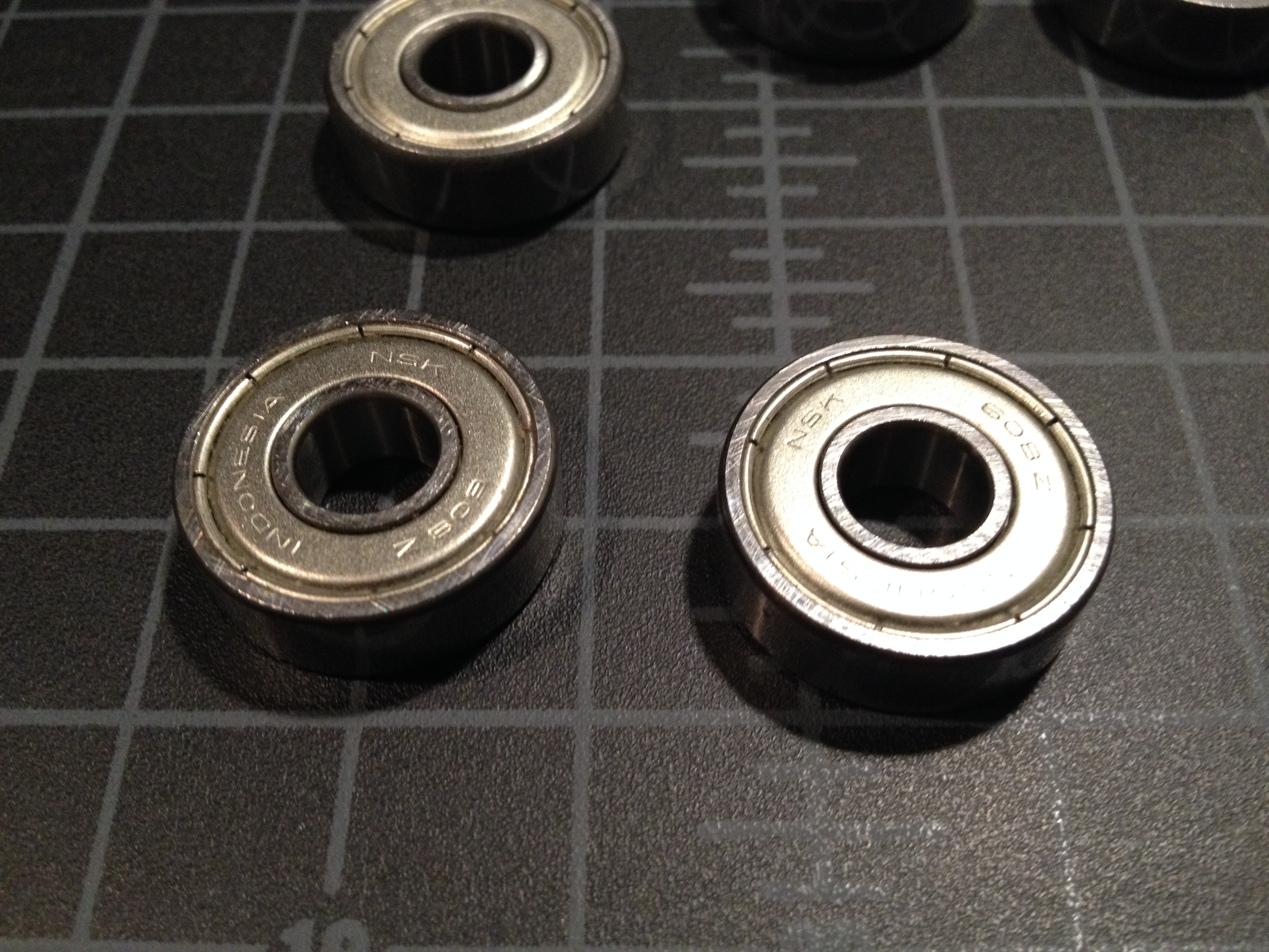 One had a slightly collapsed cover, and the other was obviously contaminated with some kinda solvent/chemical. Both felt a little rough when spun. I might have still used them as the tensioner pulleys had I not had a couple spare 608ZZ laying around.