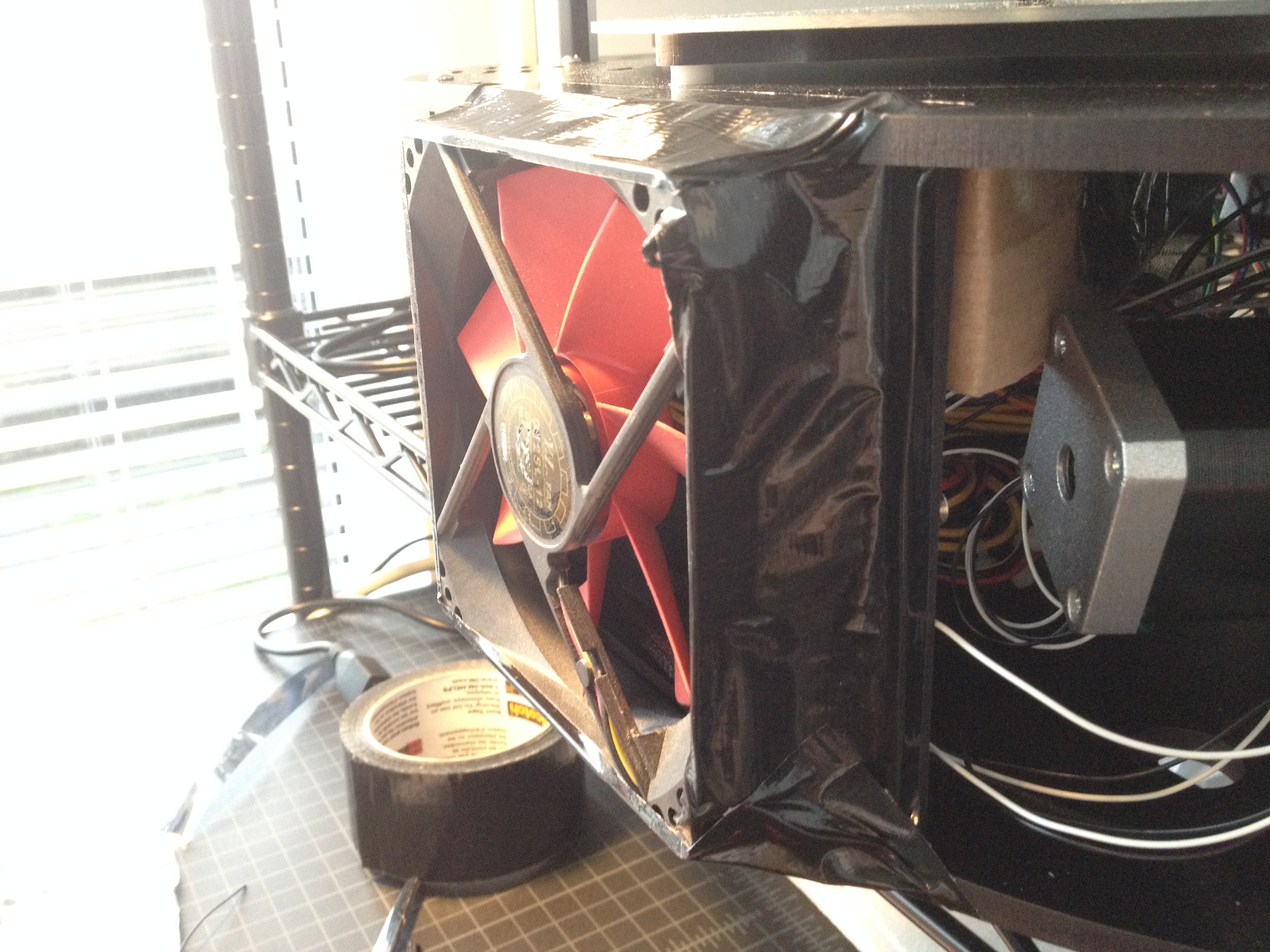 On my setup, I will have the 120mm .18A PSU fan bringing air in from the back of the case and the small slits on the rambo side, and then exhausting it out the top into the underside. I have separated the underside chamber into two at the top with the duct tape duct (actually, it's only a shroud. Do they make shroud tape?). The two 120mm .3A fans in place of the back panels will exhaust air from the PSU and from the variable-speed 80mm .4A fan blowing on the rambo (which is bringing in fresh air from the bottom vents).