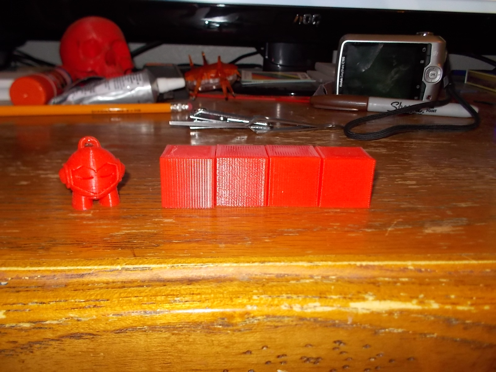 First few test prints after I got my Layer fan printed.  Just 20mm test cubes done in .1-.4 layer height and that silly Marvin guy.