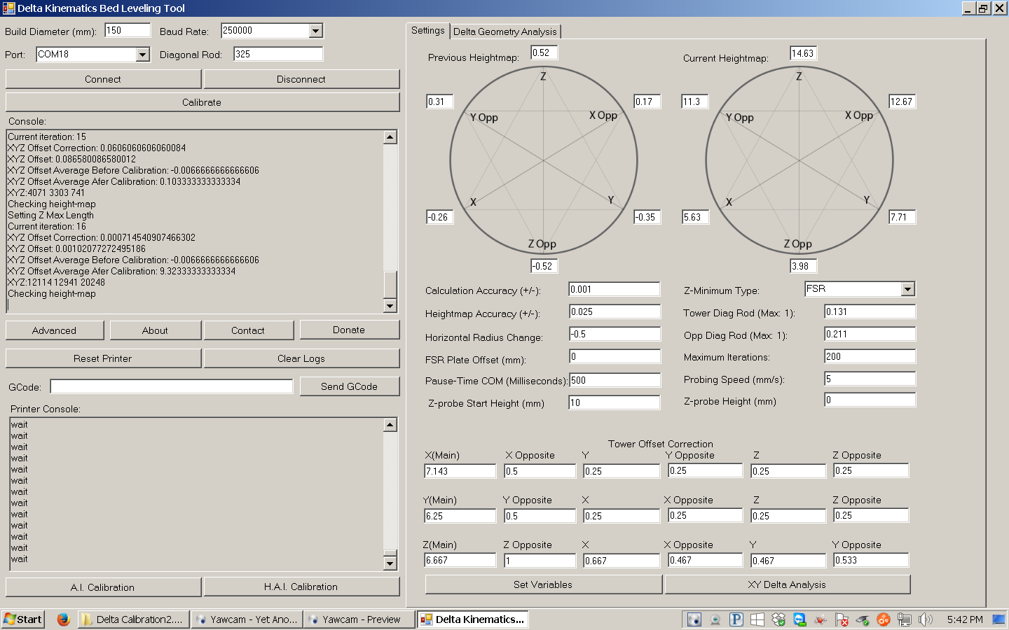 Well, your tower offsets are about 5 times what they should be in the first column. Why may you ask? Not the slightest - this is a first. However, it definitely is caused by increasingly bad XYZ offset values - impart from the left column of the Tower correction. I would recommend using the default values for the time being, it will just take longer to calibrate. (I will have a new version up tonight - will work a lot better)