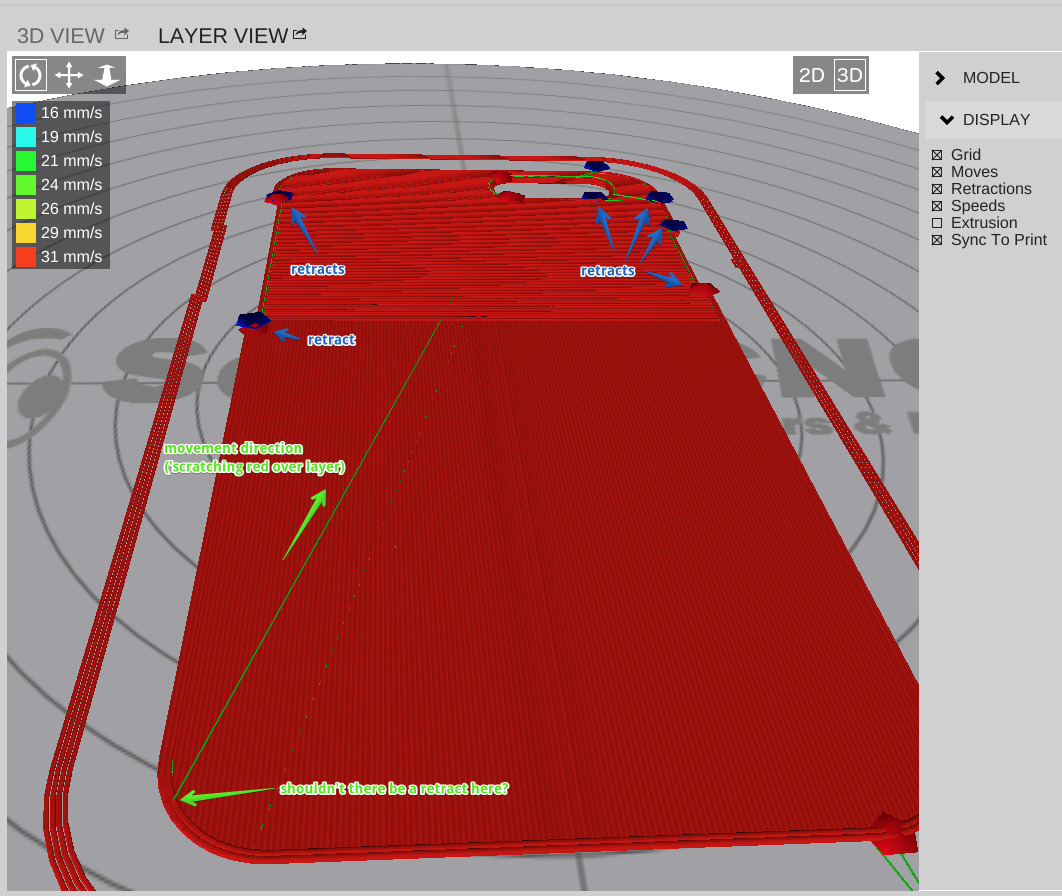 During the printout the print head nozzles relocates a couple of times to start printing again. So far so good. I observed that there was some oozing and found out that there was no retract of the filament done. Even worse, the print head didn't lift up for 0.3mm while moving and just sort of scratched over the surface. This made resulted in some noise during movement over the printed 'lines'.