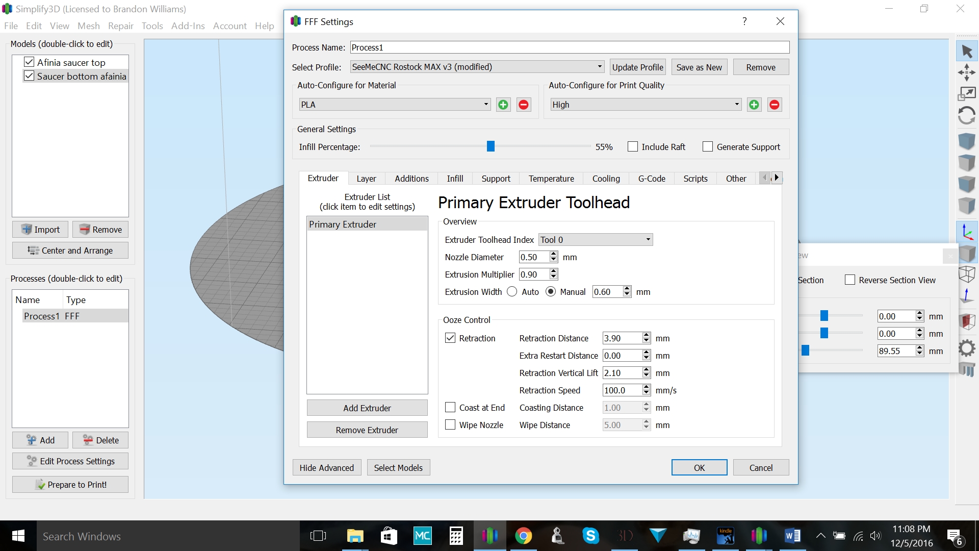 Hey, I'm having trouble with my S3d settings and the amount of stringing occurring. If I go above 6mm retraction distance, the extruder nozzle seems to clog really quick and the filament is grinded down in spots. I have attached a screenshot of my s3d settings and a pic of my print. I welcome suggestions and tips please!