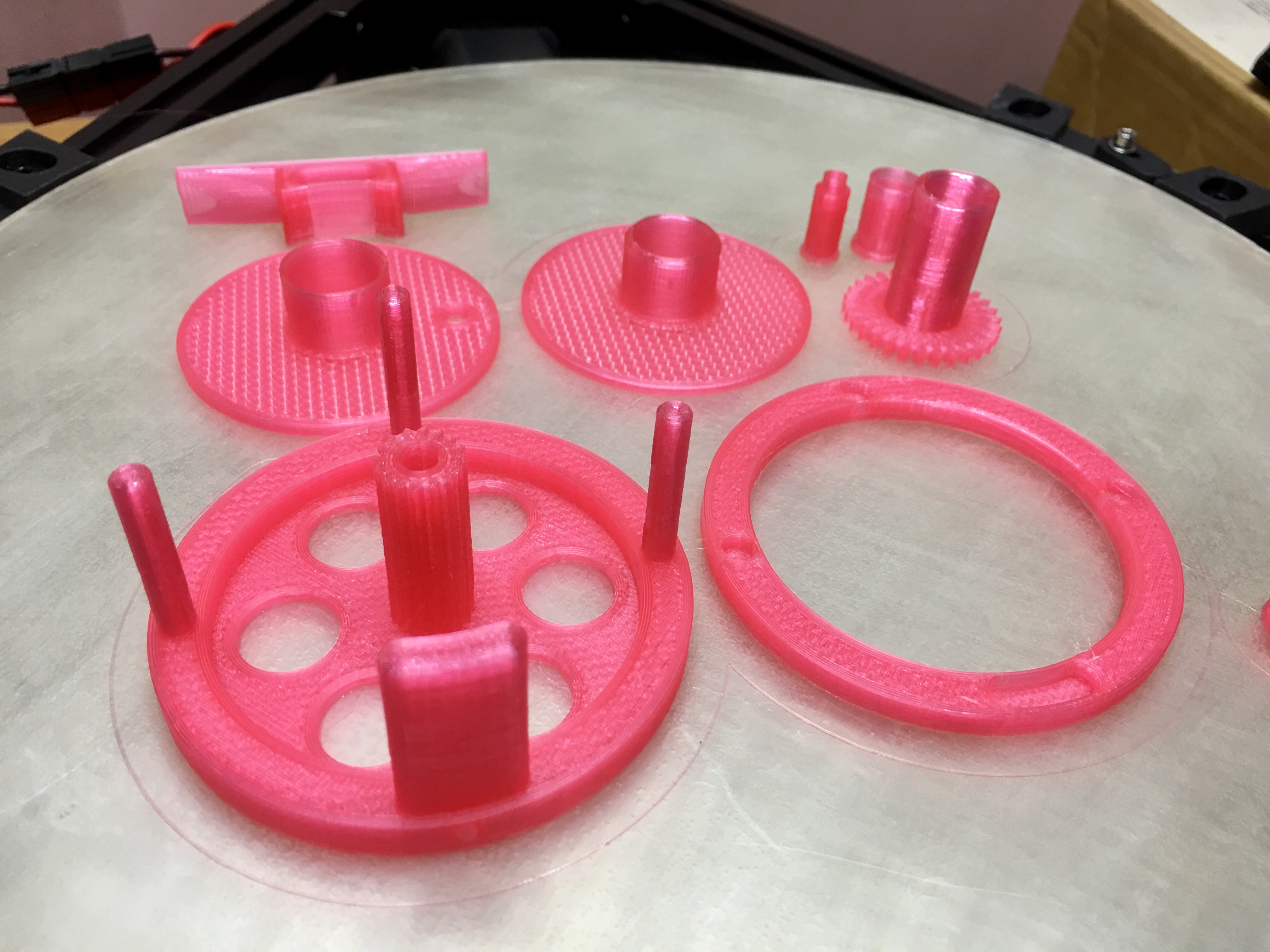 Here is a platter of parts I just printed. I have not touched any part and as you can see, no stringing whatsoever. Those thin pillars are very challenging as are the parts with the open weave and the "gear" looking part.
