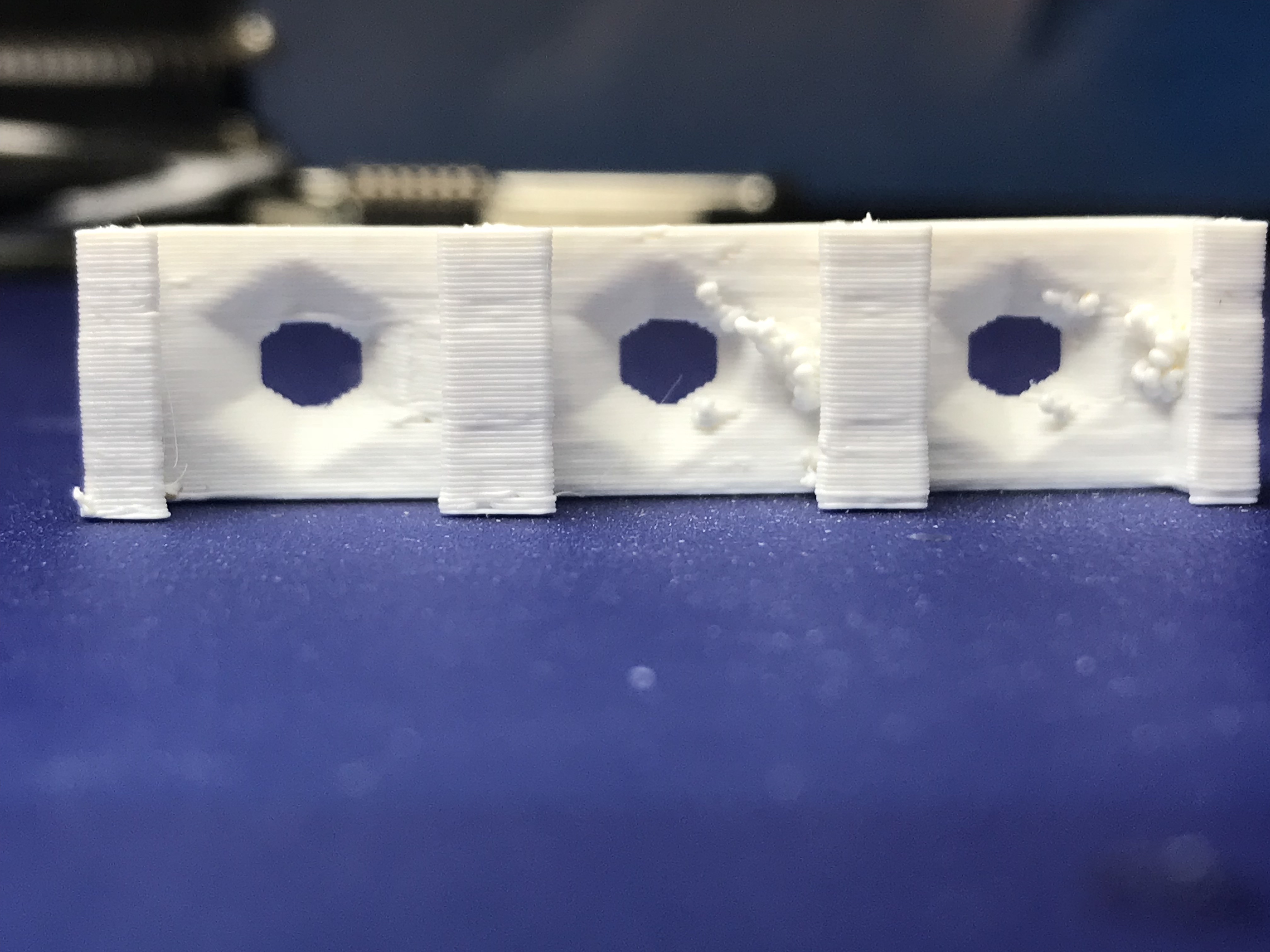 The real problem is the skewing. The test square from my previous posts had more than 1mm +/- error in the X and Y axes. And sharp angles come out with curvy irregularities. I'm pretty sure that's contributing to the beading and layer misalignments in these other pics: