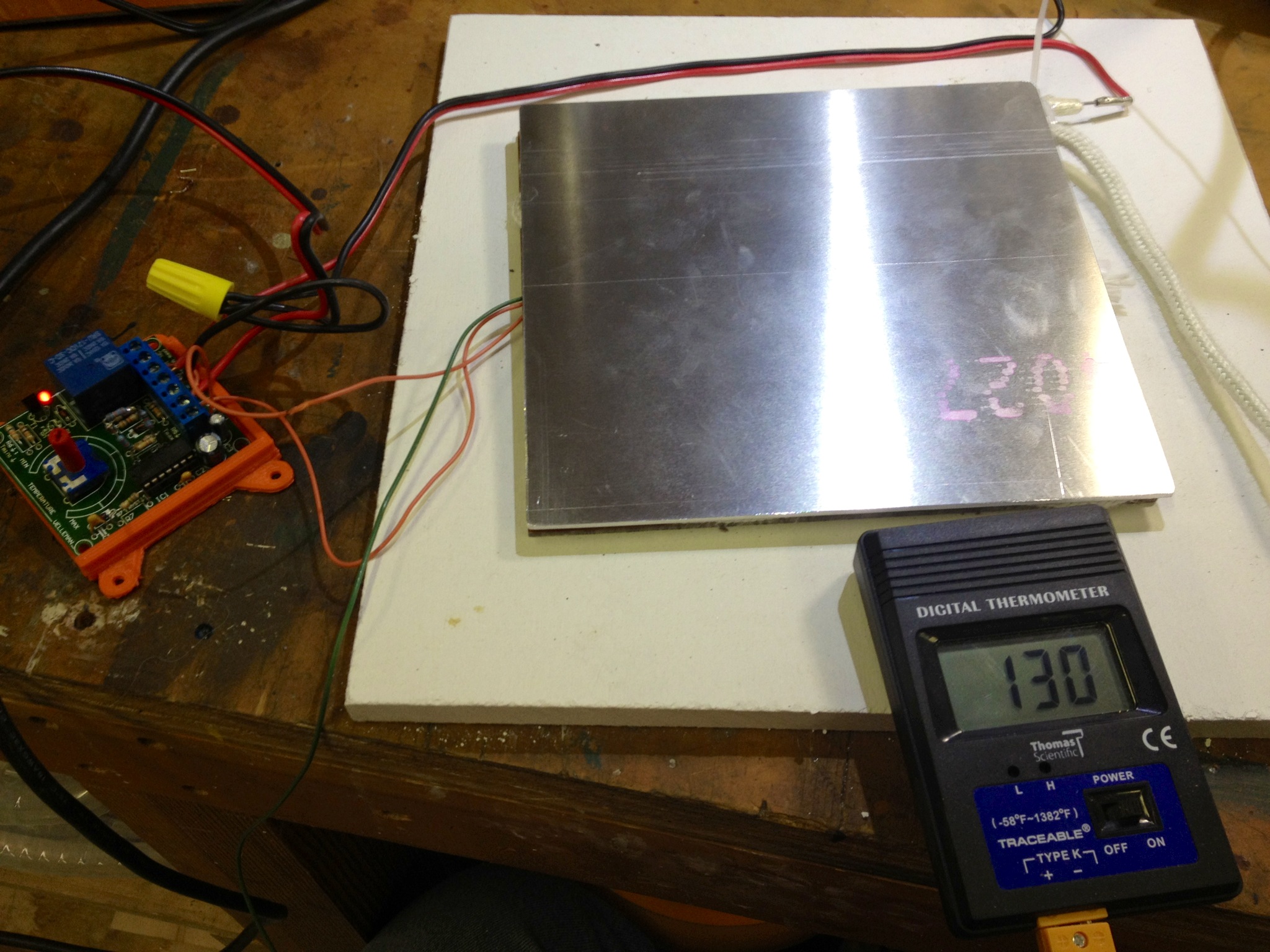 The Velleman is stock so the temp won't go over about 90°F. I need to calculate the resistor to swap with R5. The aluminum plate is just some old tooling I had. I wanted to make sure the heater worked before cutting my good stuff! I'm ready to go now.