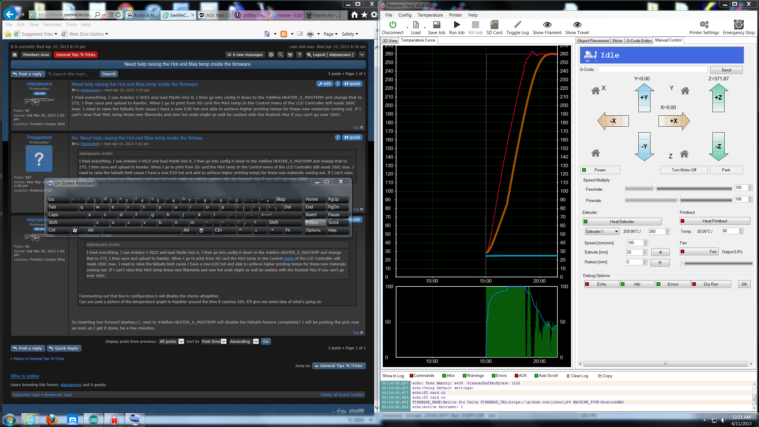 So inserting two forward slashes,//, next to #define HEATER_0_MAXTEMP will disable the failsafe feature completely? I will be posting the pick now as soon as I get it done, be a few minutes.Polygonhell wrote:Commenting out that line in configuration.h will disable the checks altogether.elqisqeyano wrote:I tried everything. I use Arduino V 0023 and load Marlin into it, I then go into config H down to the #define HEATER_0_MAXTEMP and change that to 275, I then save and upload to Rambo. When I go to print from SD card the MAX temp In the Control menu of the LCD Controller still reads 260C max. I need to raise the failsafe limit cause I have a new E3D hot end able to achieve higher printing temps for these new materials coming out. If I can't raise that MAX temp these new filaments and new hot ends might as well be useless with the Rostock Max if you can't go over 260C.