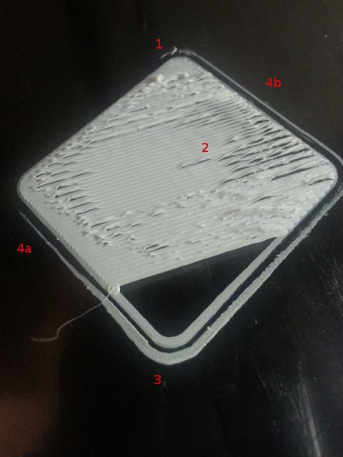See how thin the layer of plastic is under the number 1 corner, gradually getting thicker towards 2? You can see the little blobs, not ripples, just above the 2 in the picture. Those are caused by the hot nozzle shaving the plastic off. It stops shaving and starts rippling as soon as the nozzle is far enough away to extrude the appropriate amount of plastic. Further down yet you have the correct nozzle to bed height to extrusion rate and the print looks much better.