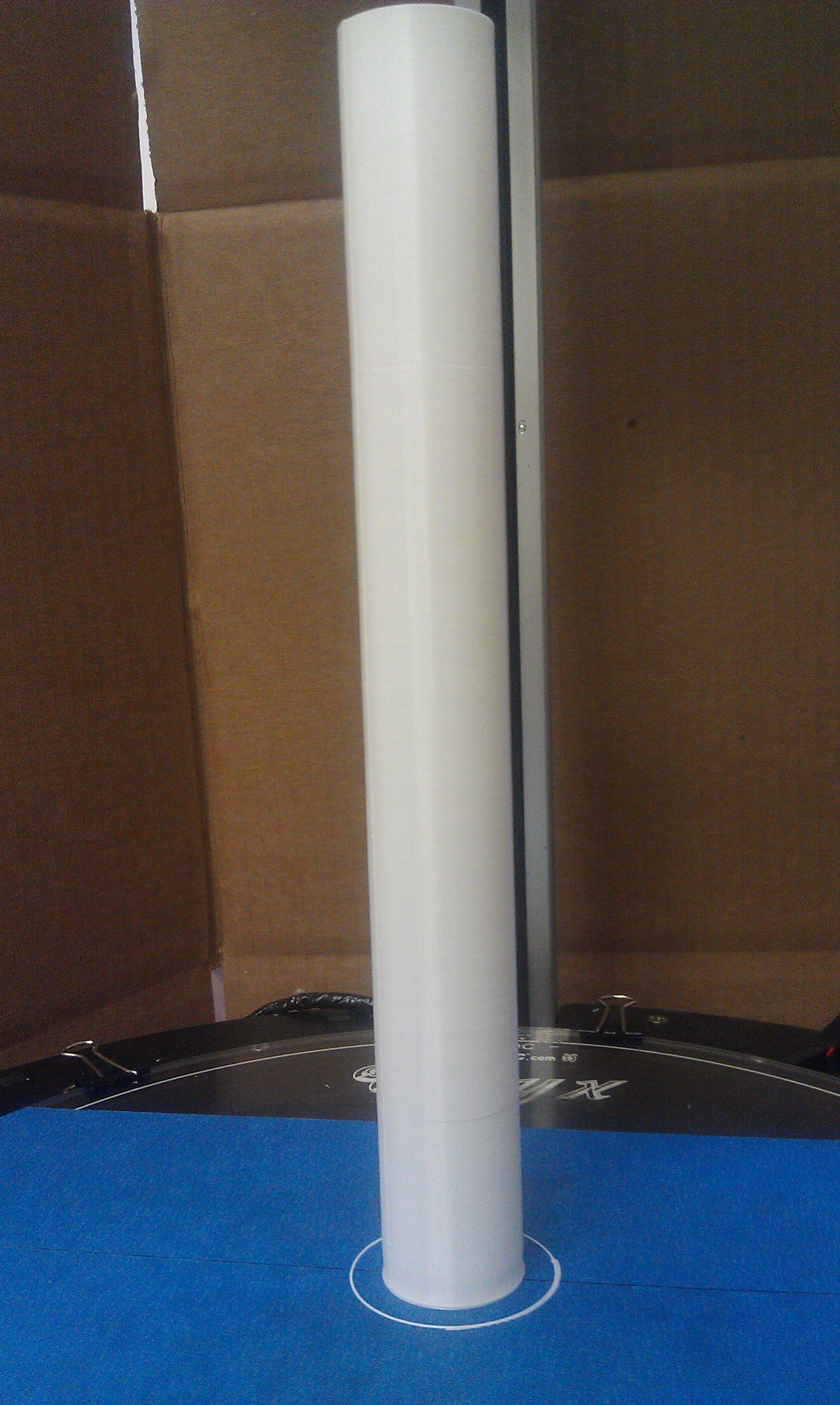 I don't have the hot-off-the-presses version of Slic3r, so it didn't have the "spiral vase" setting. But I figured I'd print the cylinder anyway. The interesting thing is that where the "seam" in the cylinder is, I would have expected a perfectly vertical line. But it's not