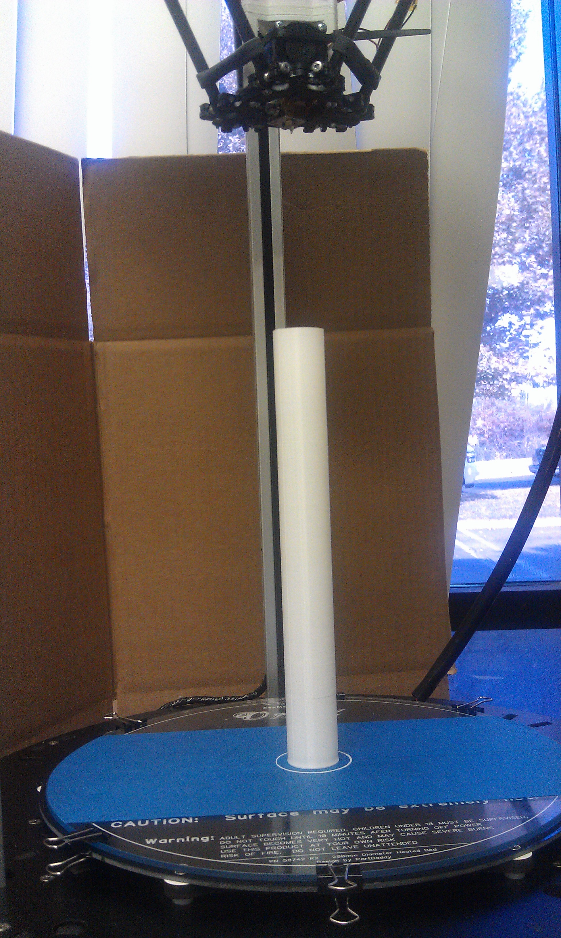 I don't know how well it's visible in this iPhone photo, but you can kind of see the seem going up and to the left. Now that it's off the print bed I realize that it started shifting sooner than I thought. In fact, I think the shifts started right after I had increased the print speed via the LCD. One other thing I think *may* contribute to the problem is that I have my cables from the print-head and fan zip-tied to the bowden tube. My printer is behind me and occasionally I heard a funny sound. But I turned around and didn't notice anything -- except once when I saw that one of the zip-ties was clicking against the mount where the extrude is. I'm wondering if the cables bumping against things are causing shifts of some sort.cope413 wrote:As for the "seam". Mine is straight, but it has 3 distinct segments. Not sure why it shifted slightly every 7-8cm, but I'm guessing it has to do with the slicer spiral vase code.