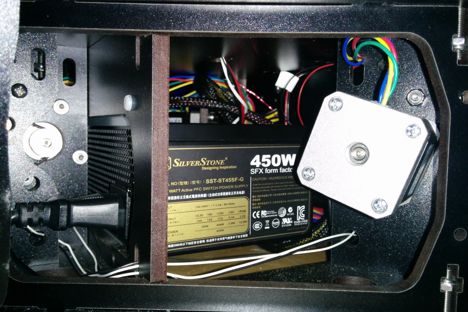 Removed the power supply and checked the fan - it's fine. In the process, I cut off every single non-essential wire. I opened up the power supply and cut the wires as close to the PCB board as I could to prevent any shorts. I left 1 set of GND/12V/5V wires for later. Everything else went away (MoBo connector, hard drive connectors etc.). This really cleared out the wiring space under the ORION.