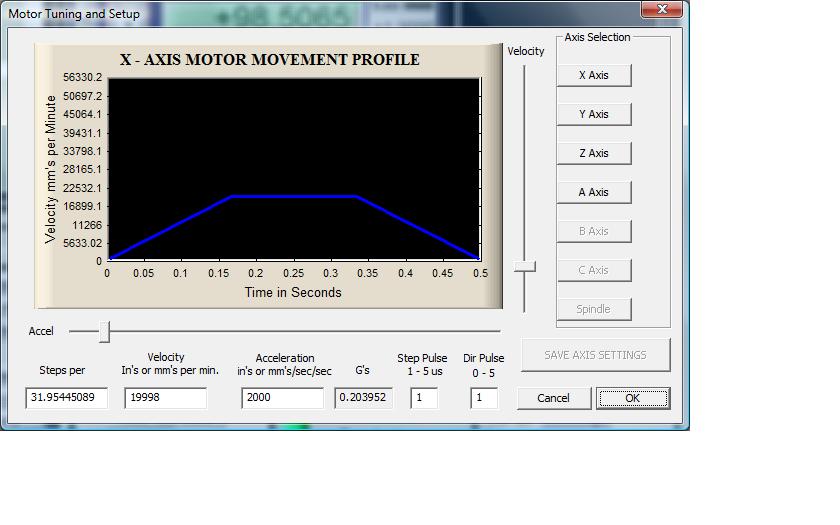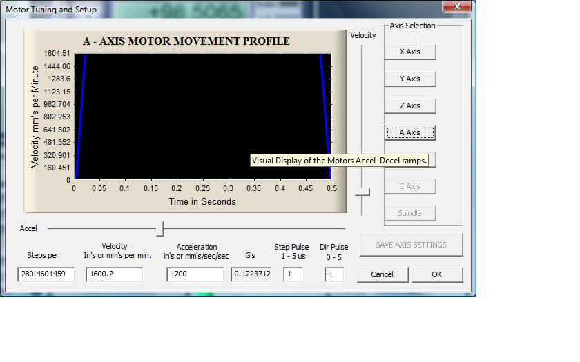 Calibrate A Axis will 100mm/min or less to get a accurate steps per setting. I guess my Accell is higher than I stated above... Problem with trying to remember info! LOL