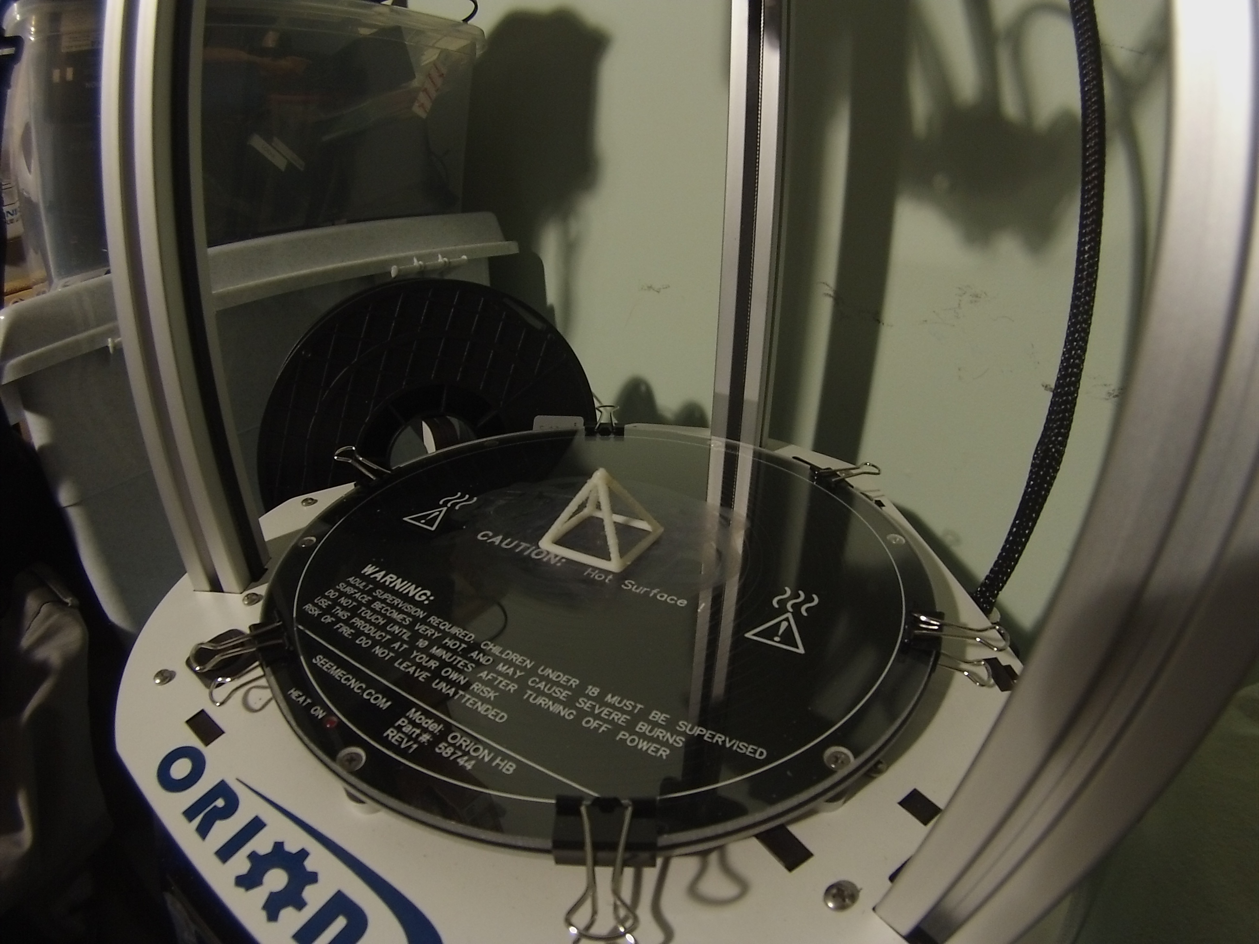 I have been reviewing all the online documentation and YouTube videos for its setup. I carefully unboxed and unwrapped the unit. I then opened up the quick start guide and quickly found out that it no longer applied. The menus were all different. I then opened up the manual that I had down loaded from the SEMECNC web site for the ORION but it too was incorrect. I quickly checked the forum and found a new manual. I down loaded it and started to setup my printer again. When I pressed the home selection, the carriage moved to the top bumped and ground until if finally stopped. Boy did that scare the you know what out of me. Obviously that was an issue. I took a closer look at the top of the towers and found that one of the limit switches had lost its spring arm. I looked around and found it laying on the floor. Luckily I was an electronics tech in the navy and am a ham operator now. I knew how to fix the problem. The Orion now homes properly. I set the Z height and printed out blinky with no issues. I was also able to print out the wire frame pyramid. I am including a photo of it. I am now off and running. Thanks to the forum.