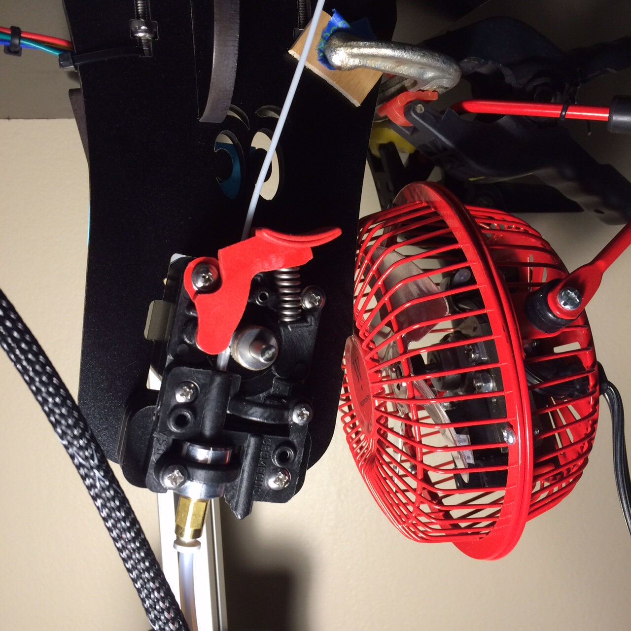 The fan, a $10 4 inch desk fan, cools the potentially hot stepper motor, so it doesn’t heat the filament and make it even more flexible. Not sure it this is a necessity or a precaution, but cooler is usually better.