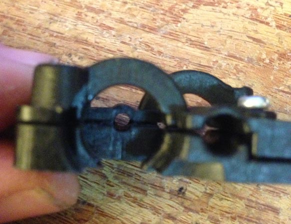Step 5: using increasing sizes of drill bits, drill out the channel where the filament runs (the 1.75mm channel)... this could be done on the 3mm side as well if you want to be able to revert back to standard if you want, I didnt bother, but thinking about it, that would work just fine... this pic is after 2 drills (one small then one step larger) take your time and run the drill through it while squeezing the halfs together being very careful to keep your fingers away from the drill bits!