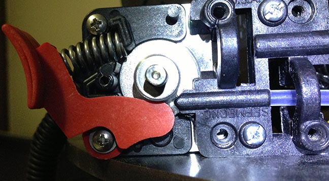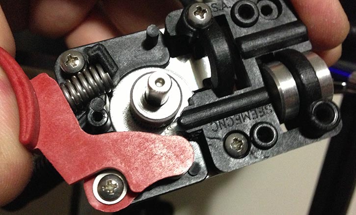 the other (ghetto yes but temporary and for testing) mods I did were increased the spring rate and also i used some pieces of abs filament to stop the ninjaflex filament from jumping behind the idler either to the front or back which was my original issue.. i also added tubing above where the filament comes through the top of the ezstruder.