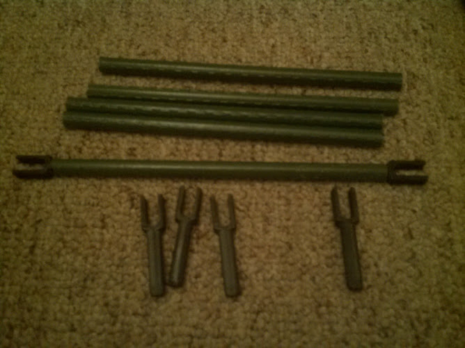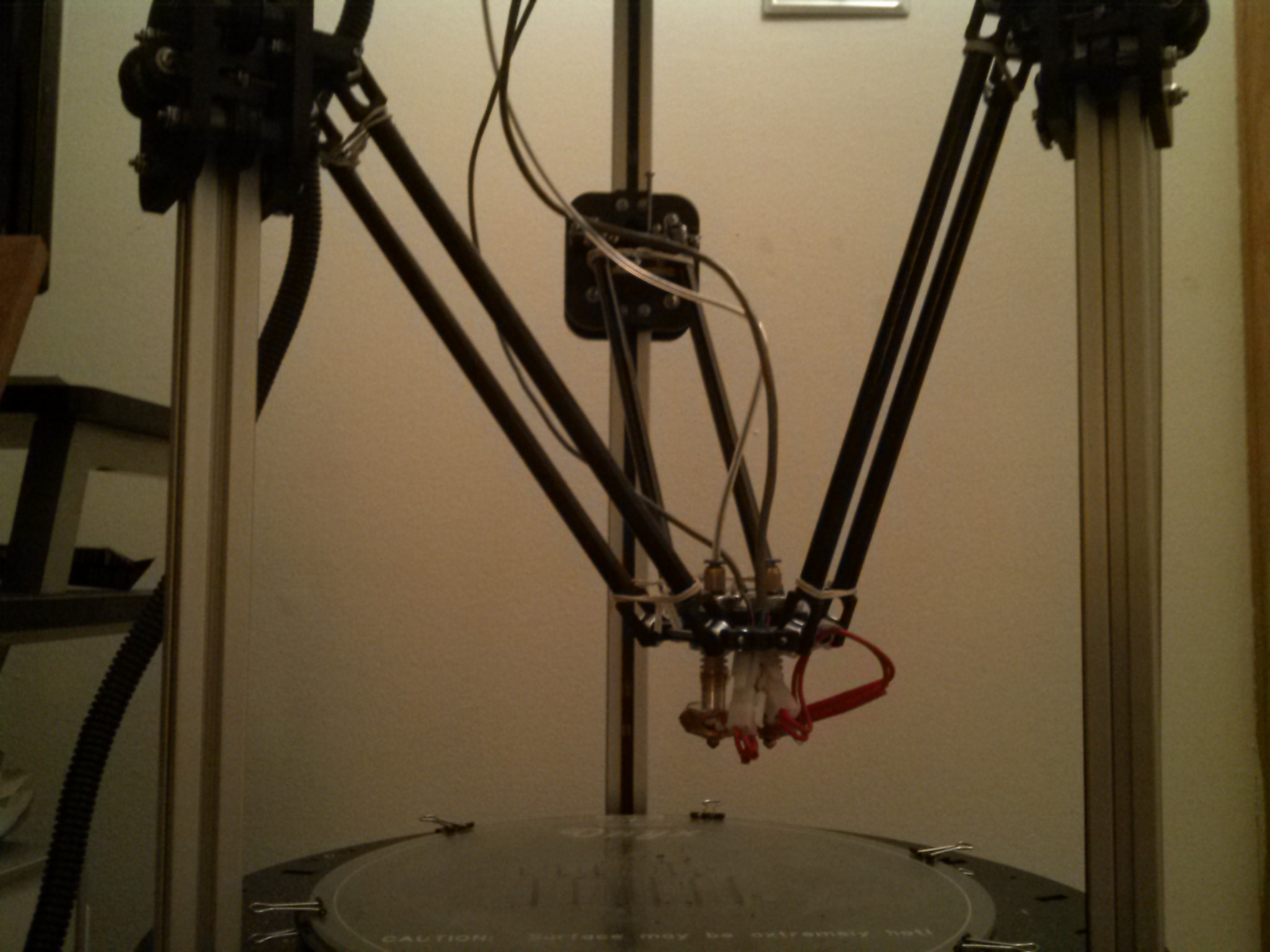 The rods are on. It is different putting them on when there is no flex, but not too hard. I had to put some rubber bands on because the U-Joints have some wiggle room side to side. It is not totally perfect, but I am pleased. I will be doing calibration sometime tonight or next week. My next prints will probably be a few more rod ends just to have spares, but I am sure the axle will die before the diagonal arms do. My friend reminded me of sacrificial points of failure and now that seems to be the axle for which my only local replacement is aluminum hobby rods from Lowes.