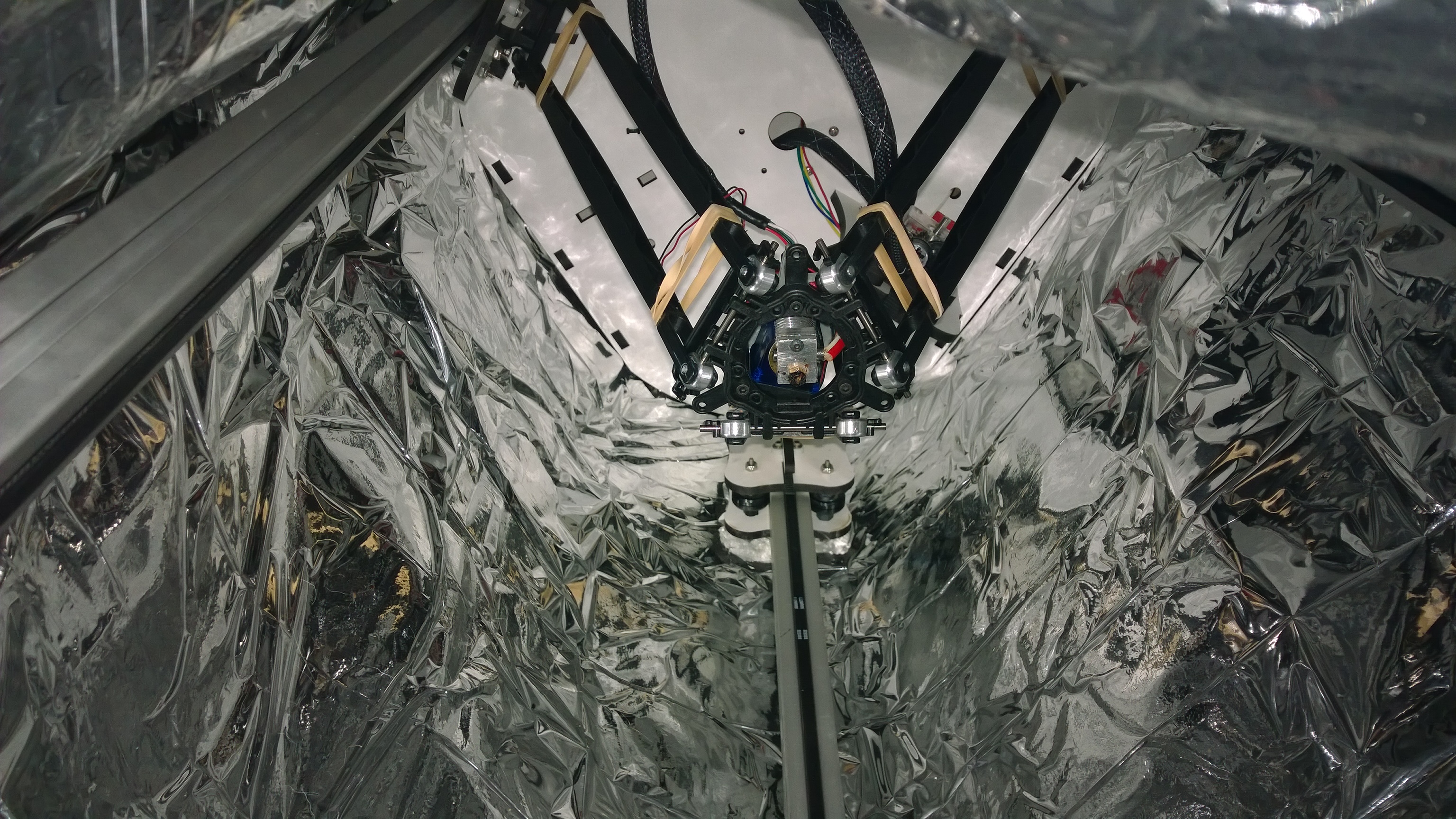 Most designs neglect radiative heat transfer. This enclosure attempts to address that issue. It is 3 layers. There are 2 outer layers of PVC coated canvas drop cloth I picked up from home depot, and the inner layer is a reflective emergency blanket (aluminized polyester). It's not ideal by any means, there is no insulation to speak of, but it should do the trick for some of my larger prints while I work the rest of the design out.