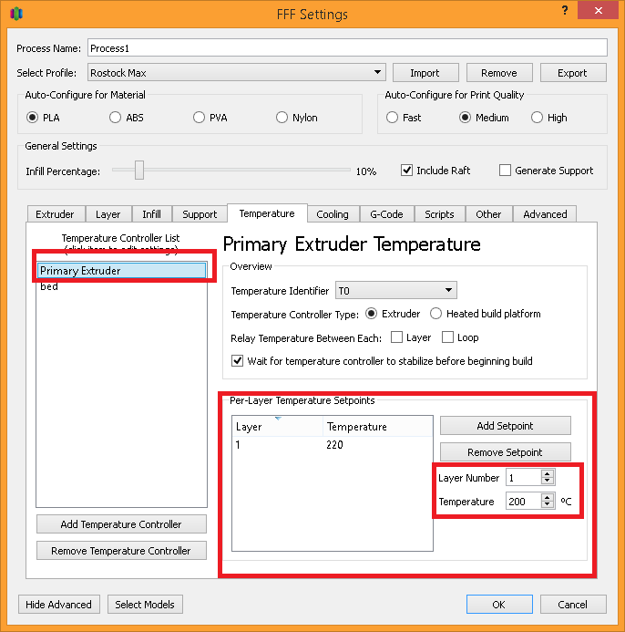 I am have a problem with setting the BED and Nozzle temperatures. I have set up to print PLA. No bed temp and nozzle temp @ 205. It starts out right but switches to ABS setting in just about 1 minute. 100 deg bed temp and nozzle @ 230. Can't figure out what I am doing wrong. Any suggestions would be appreciated.